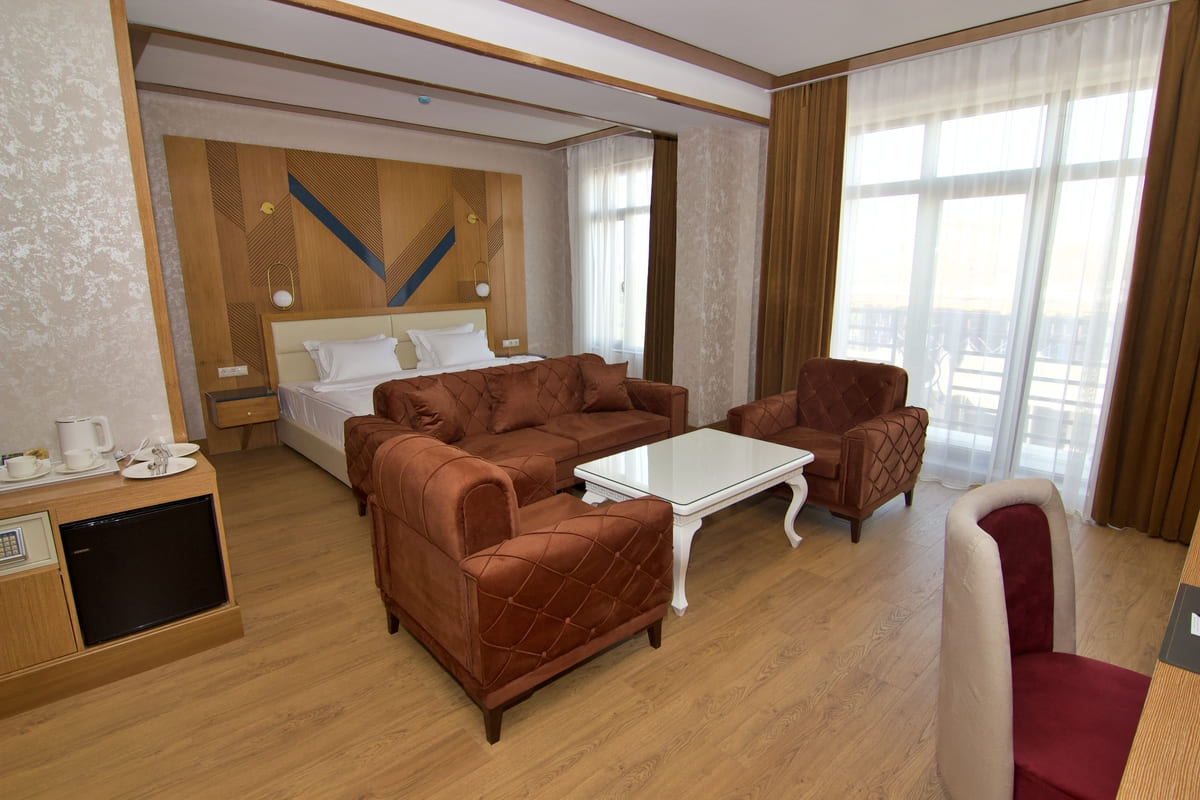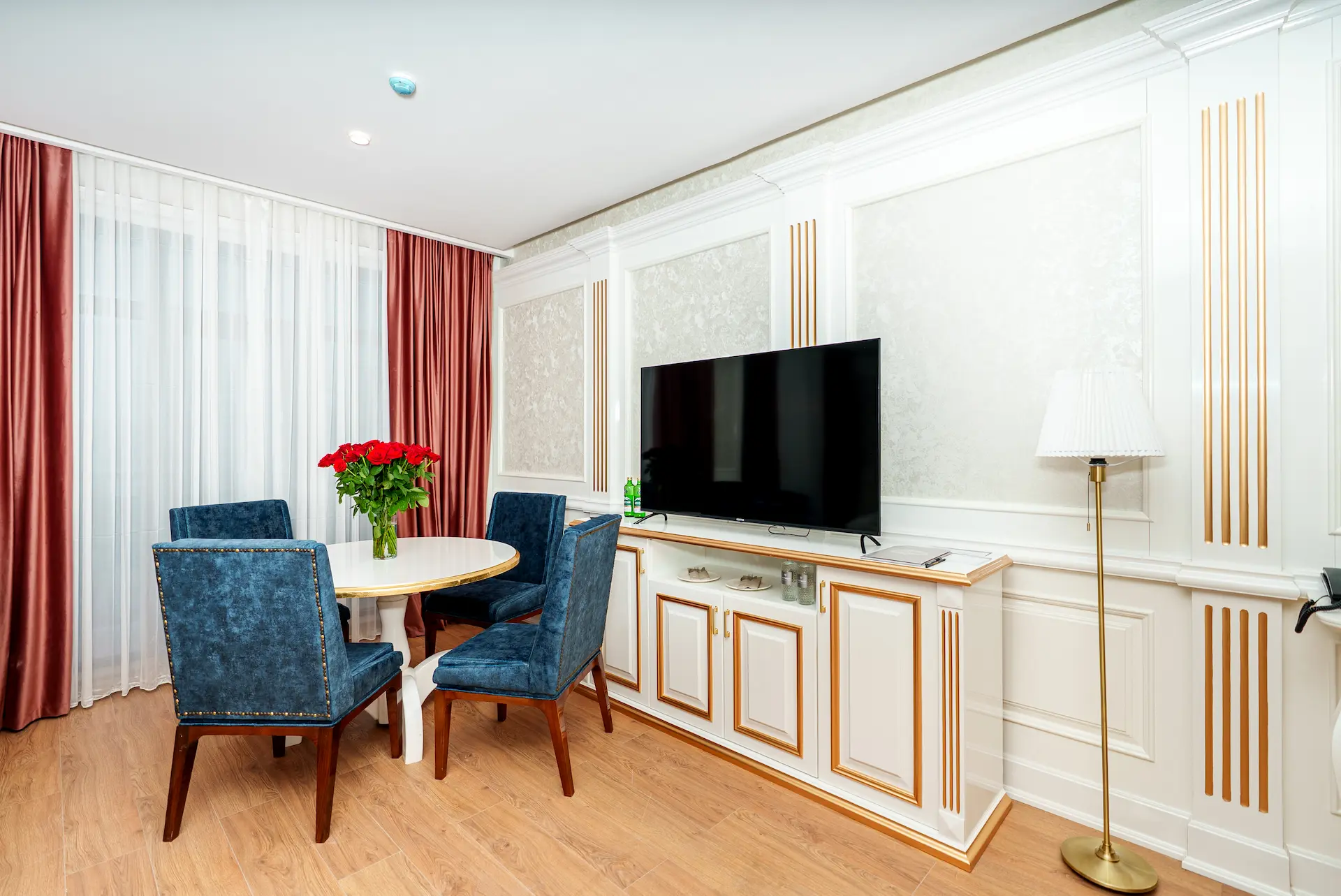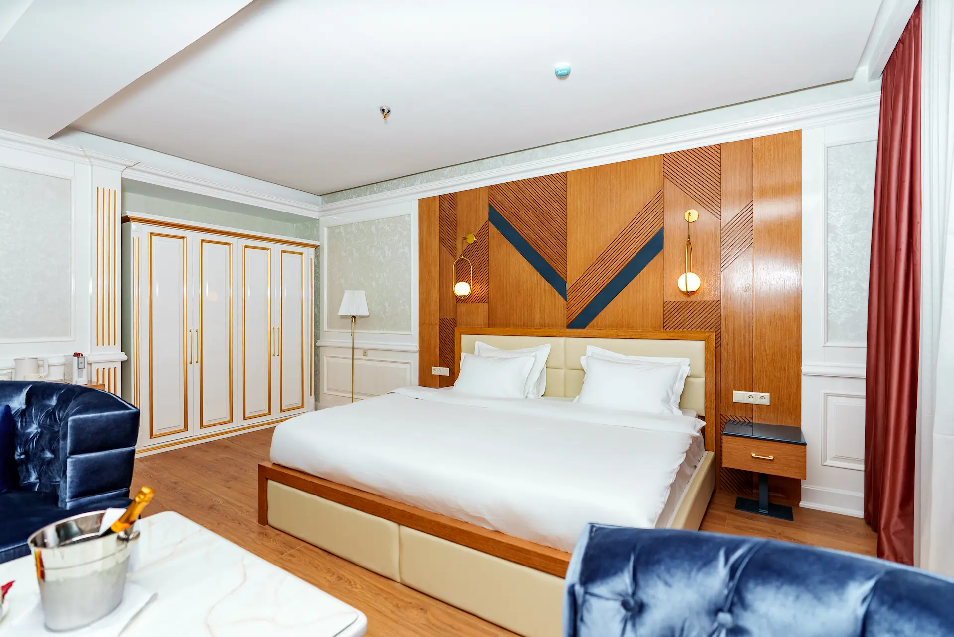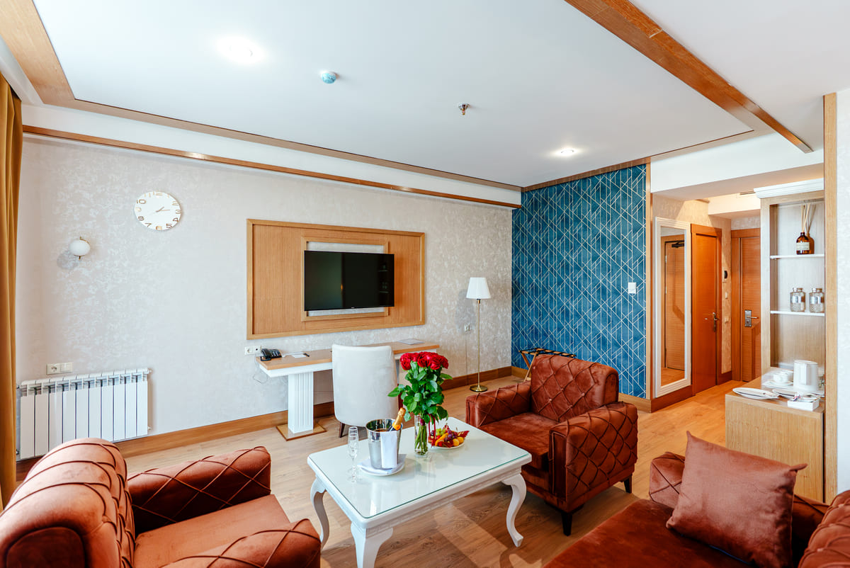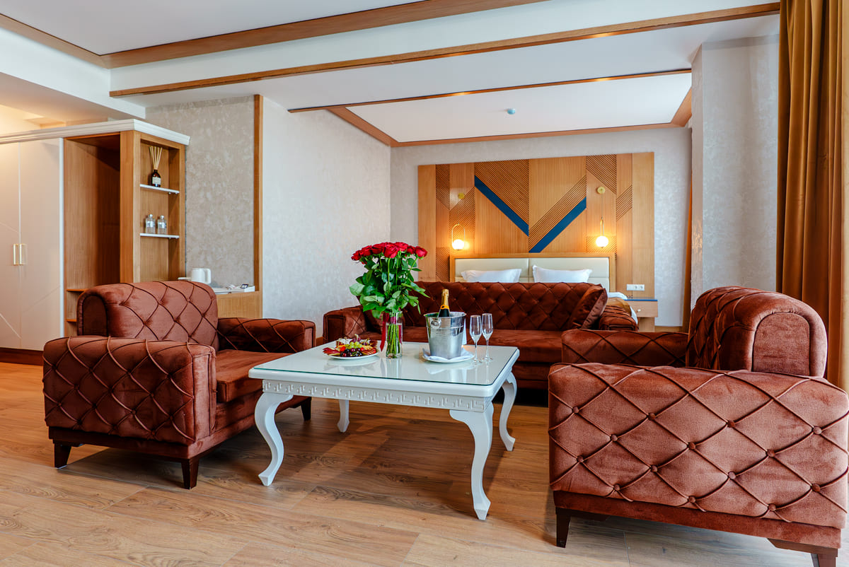 - Джуниор Сюит (32 м²) — уютный номер, созданный для отдыха и восстановления сил. Оснащён всем необходимым для комфортного пребывания, идеально подходит для релаксации.