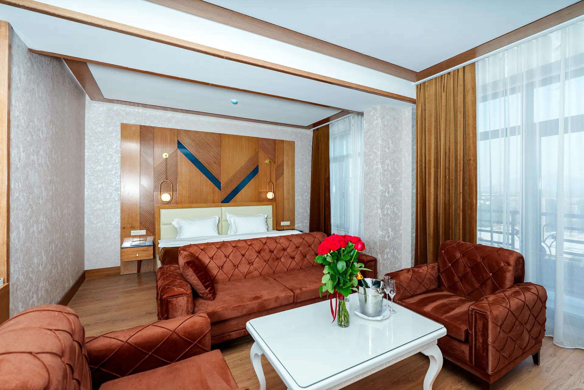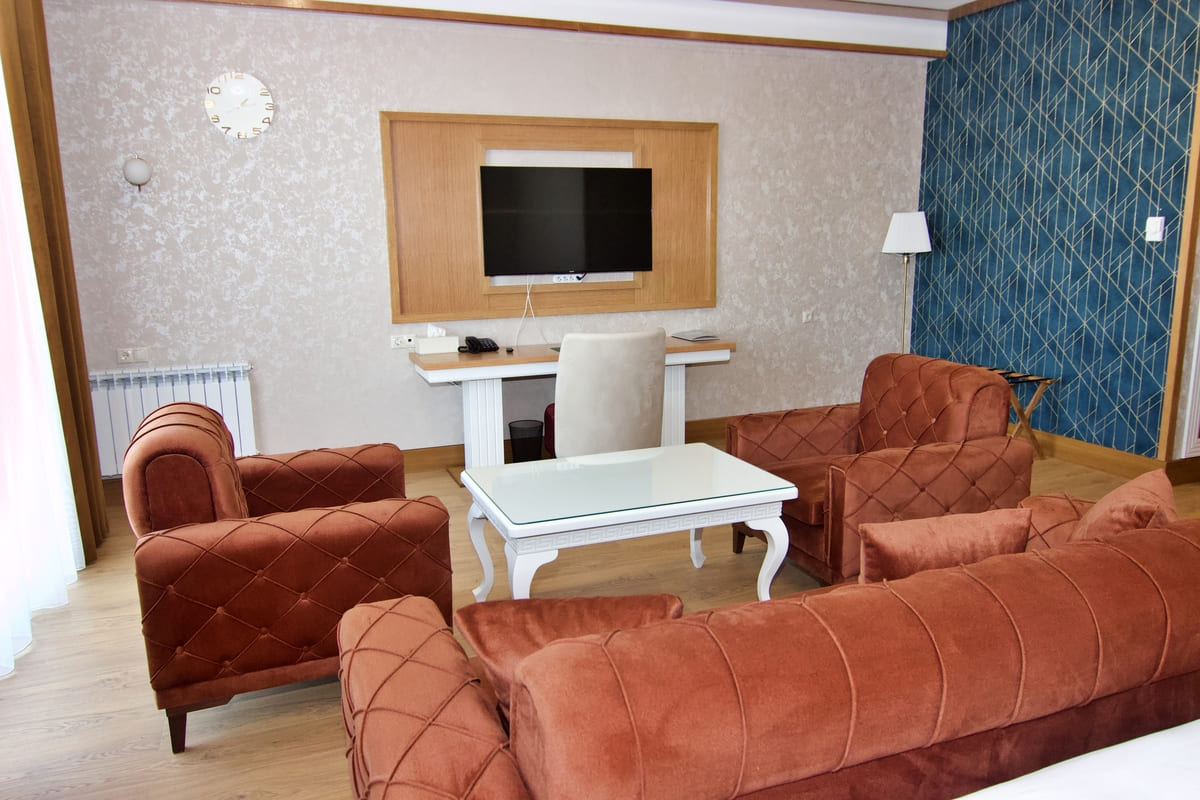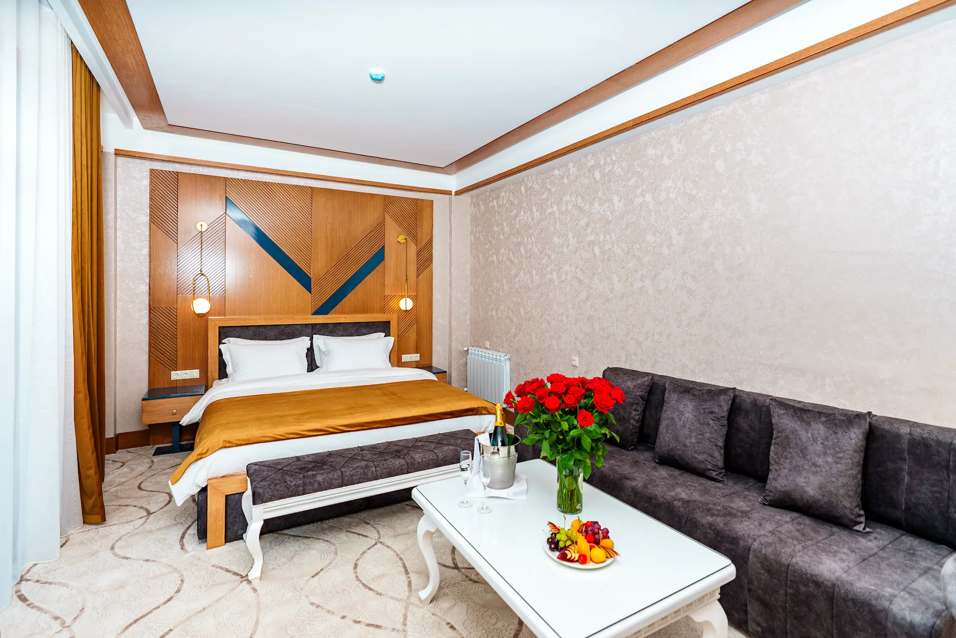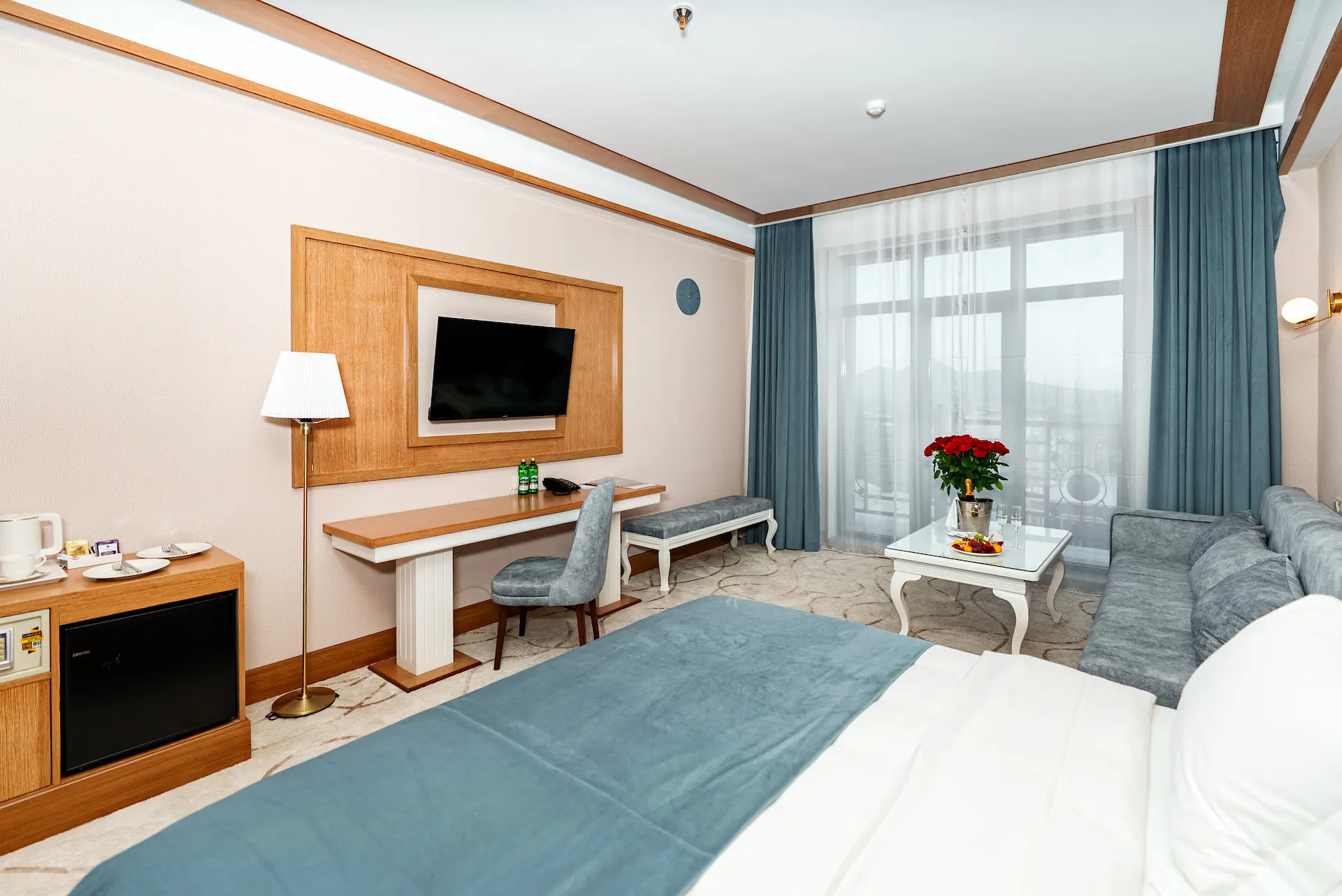 - Джуниор Сюит (32 м²) — уютный номер, созданный для отдыха и восстановления сил. Оснащён всем необходимым для комфортного пребывания, идеально подходит для релаксации.