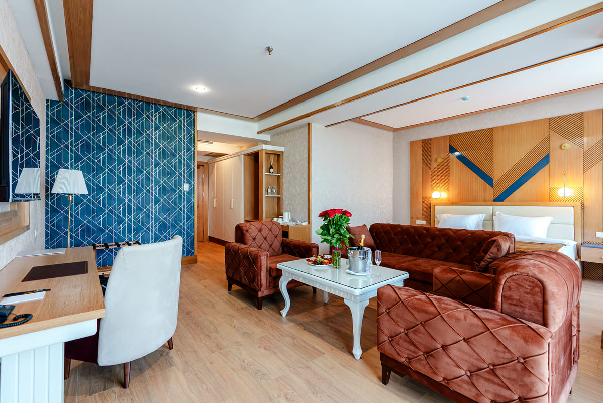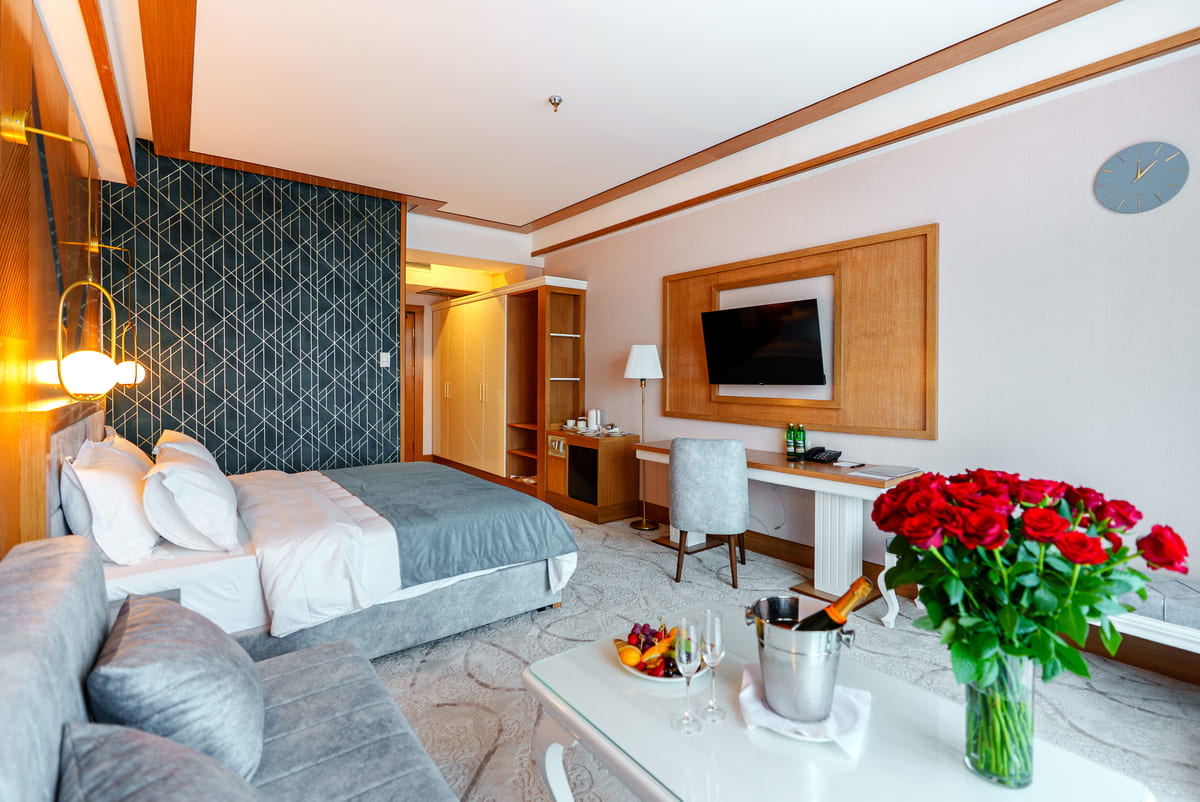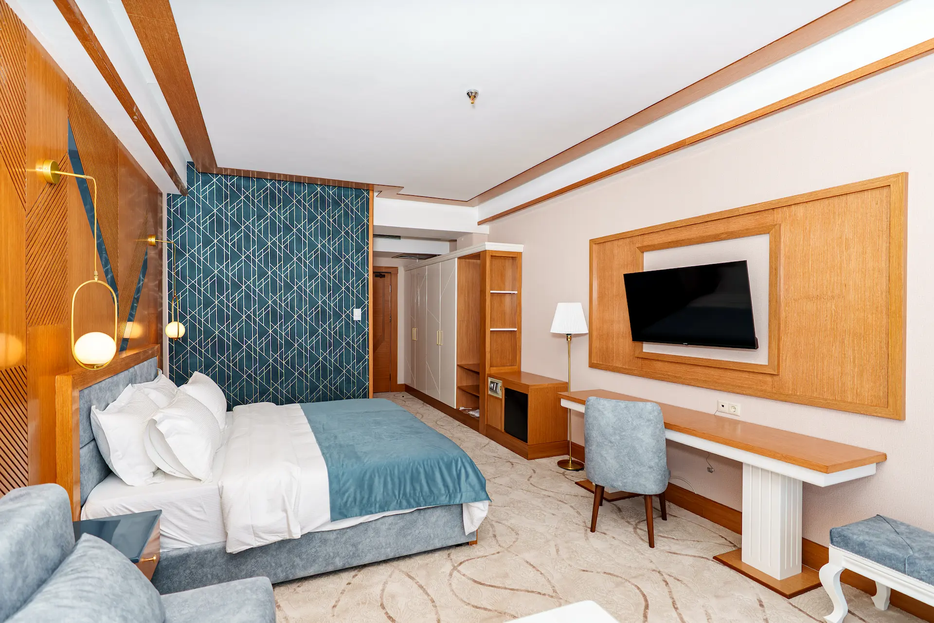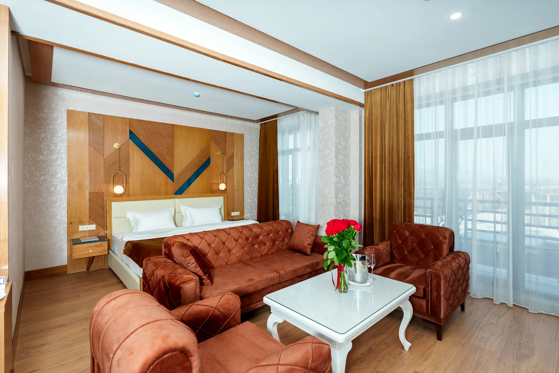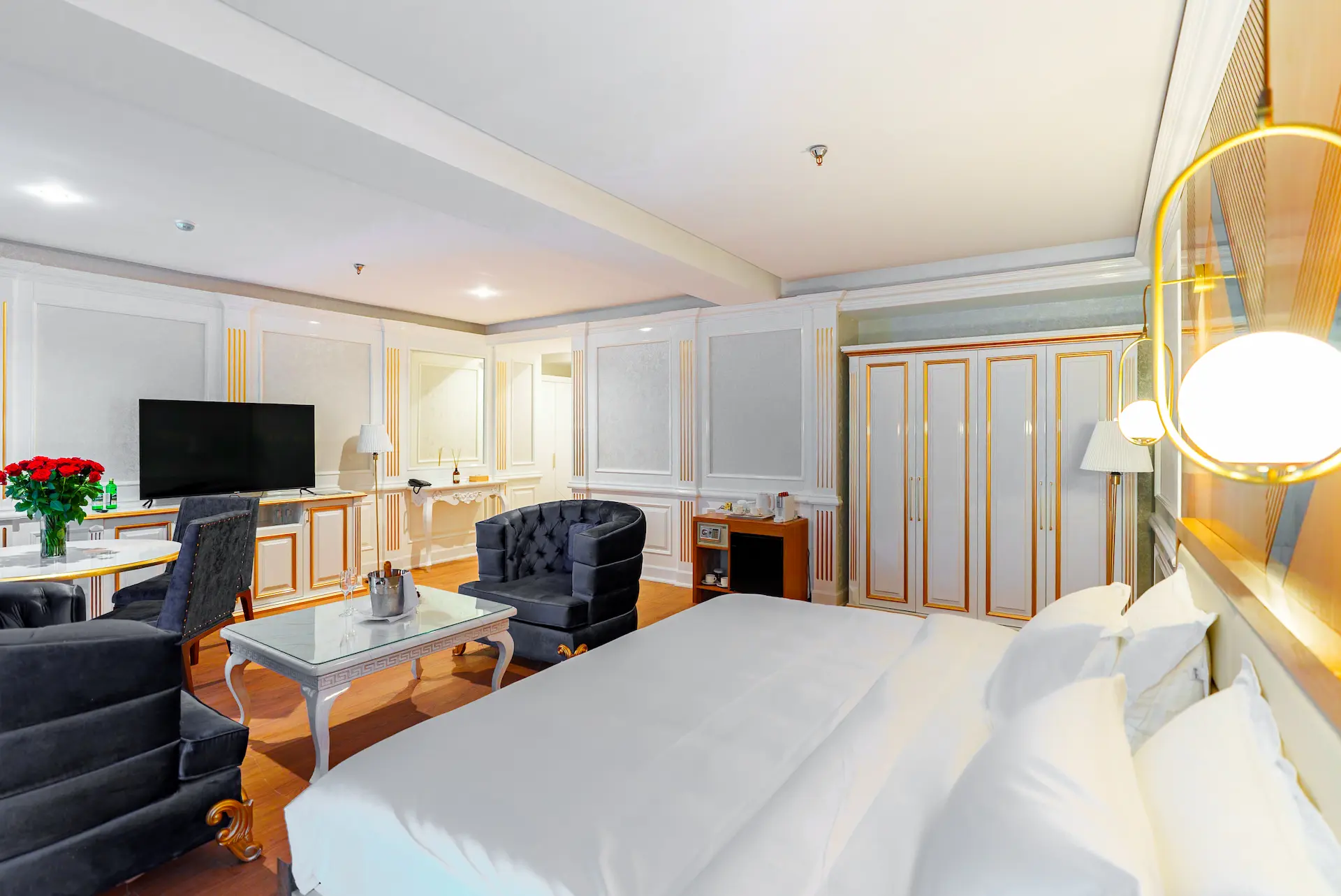 - Джуниор Сюит (32 м²) — уютный номер, созданный для отдыха и восстановления сил. Оснащён всем необходимым для комфортного пребывания, идеально подходит для релаксации.