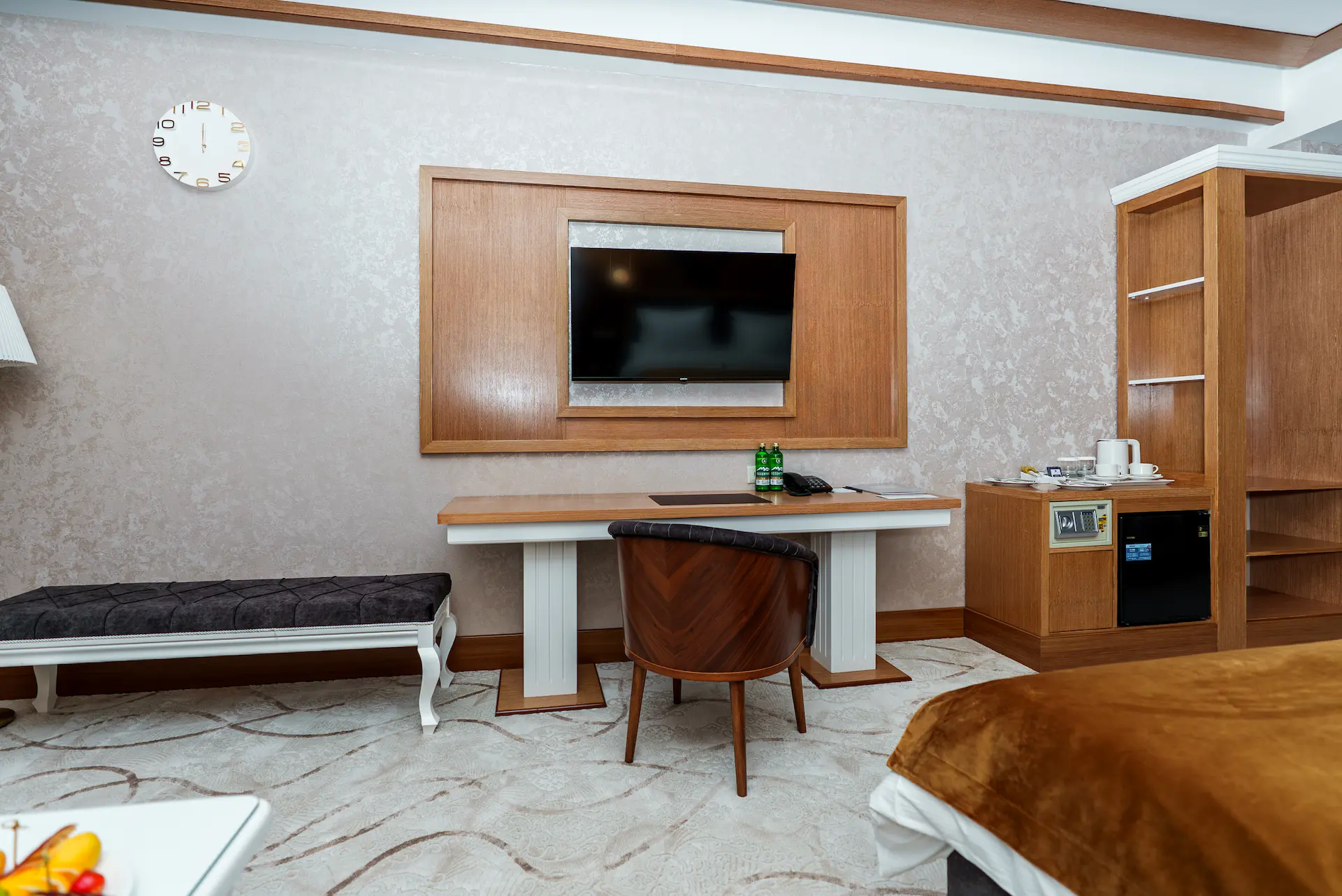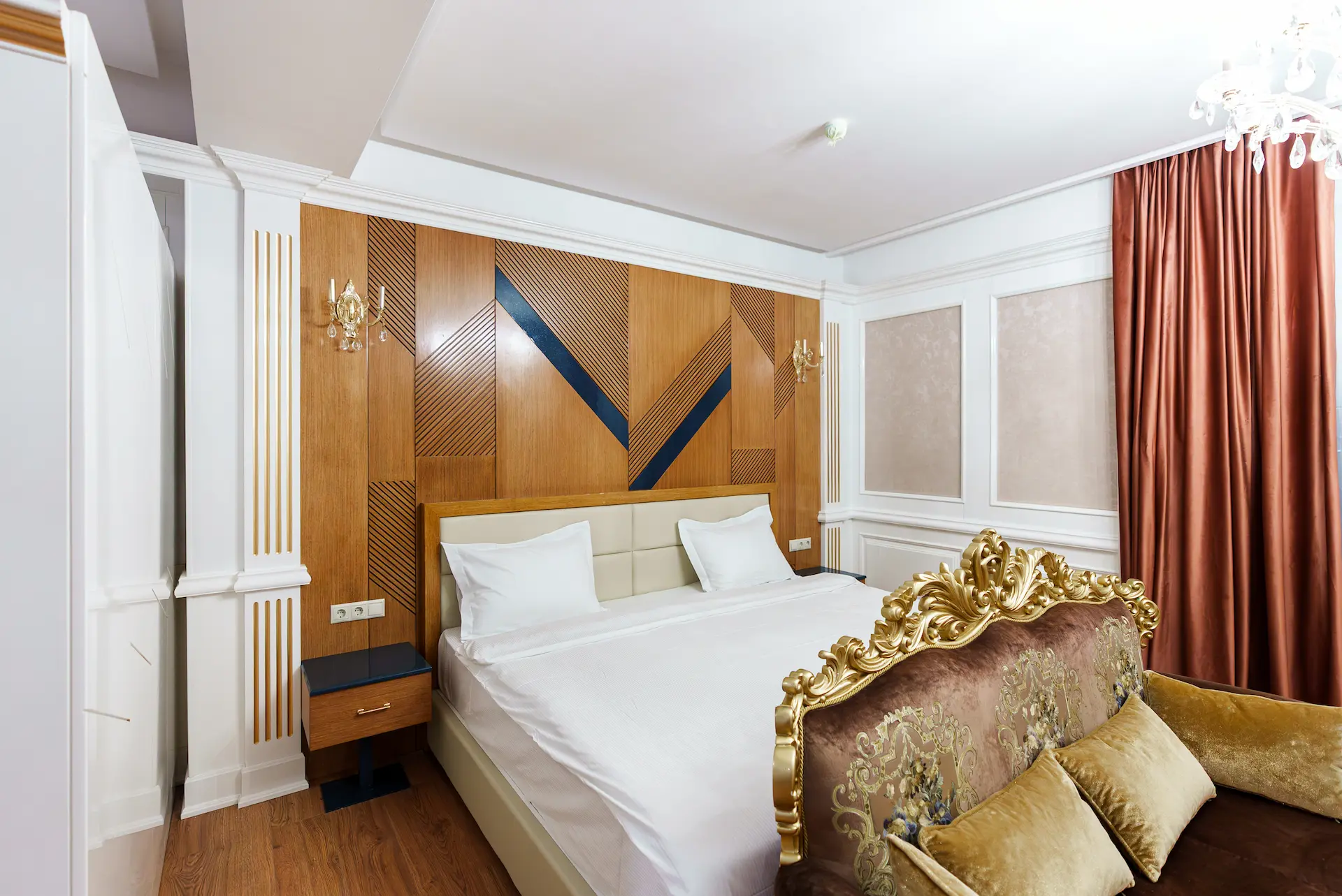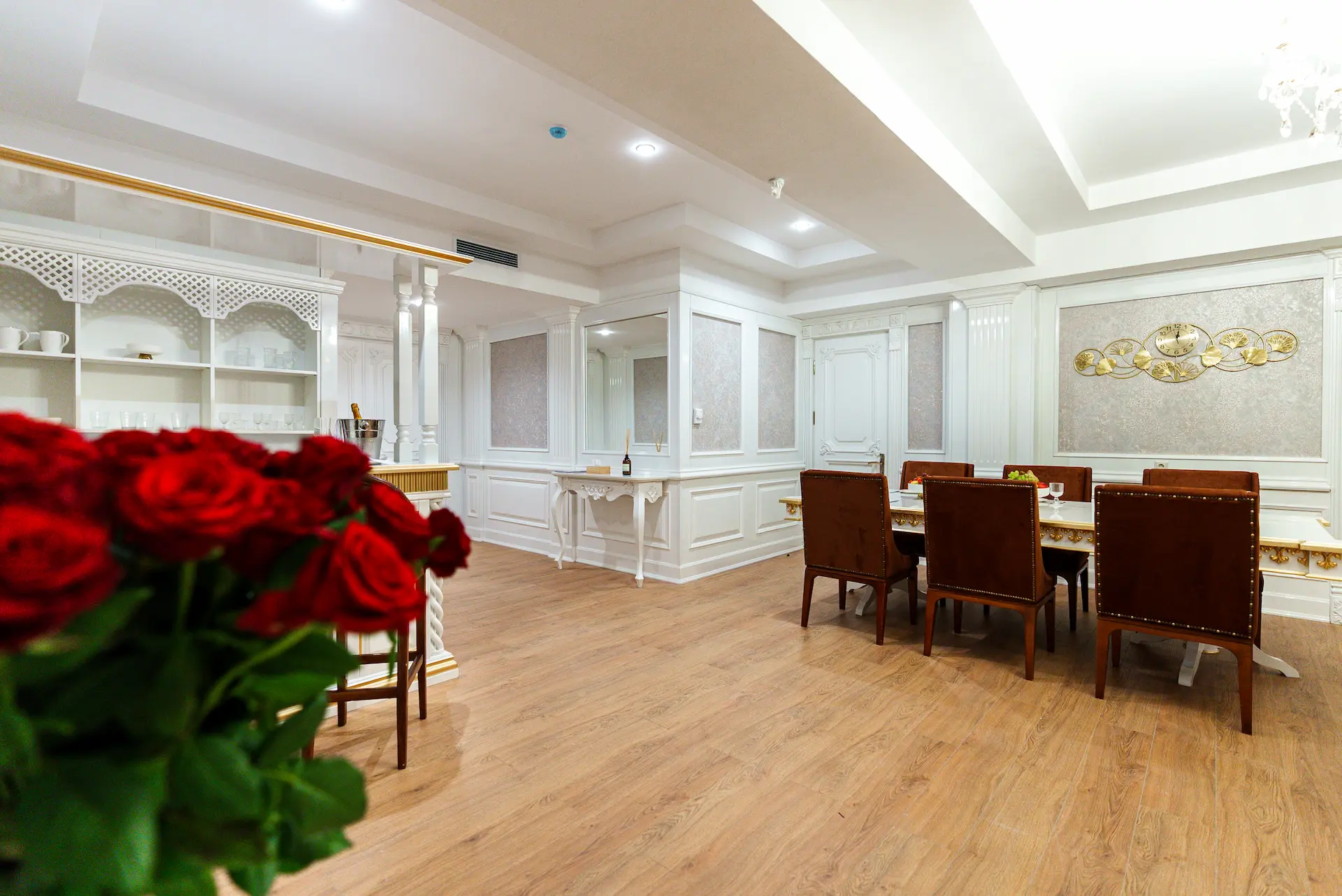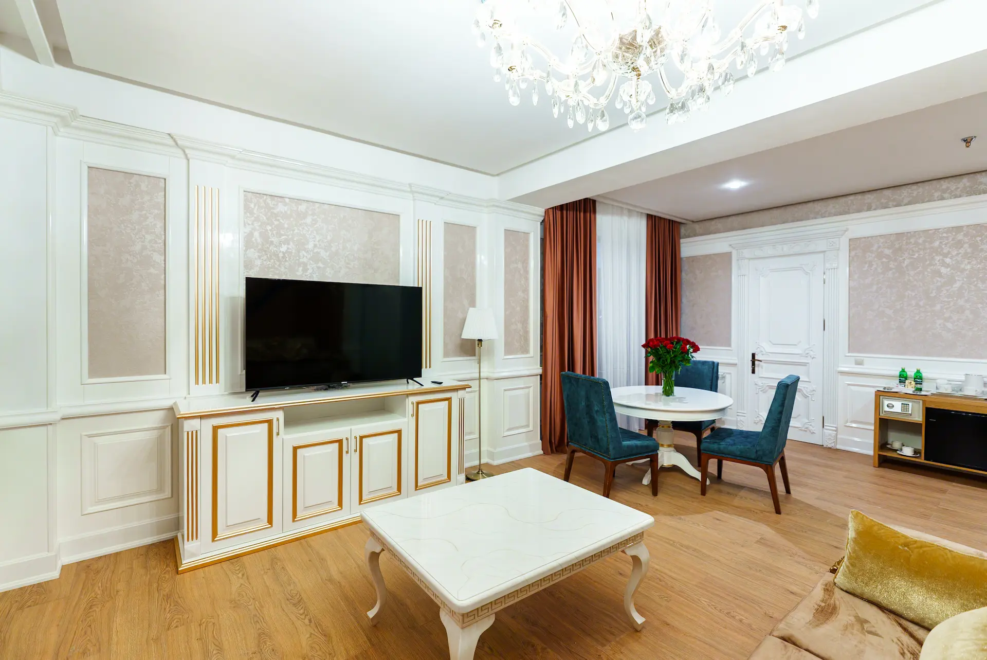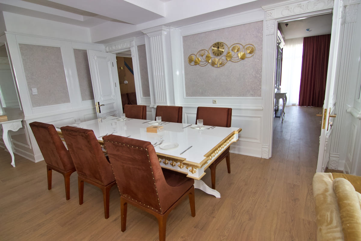 - Президентский сюит в стиле барокко (300 м²) — воплощение роскоши с просторными комнатами, элегантной обстановкой и панорамными окнами с видом на окрестности города Ессентуки. Идеален для тех, кто ищет эксклюзивный отдых.