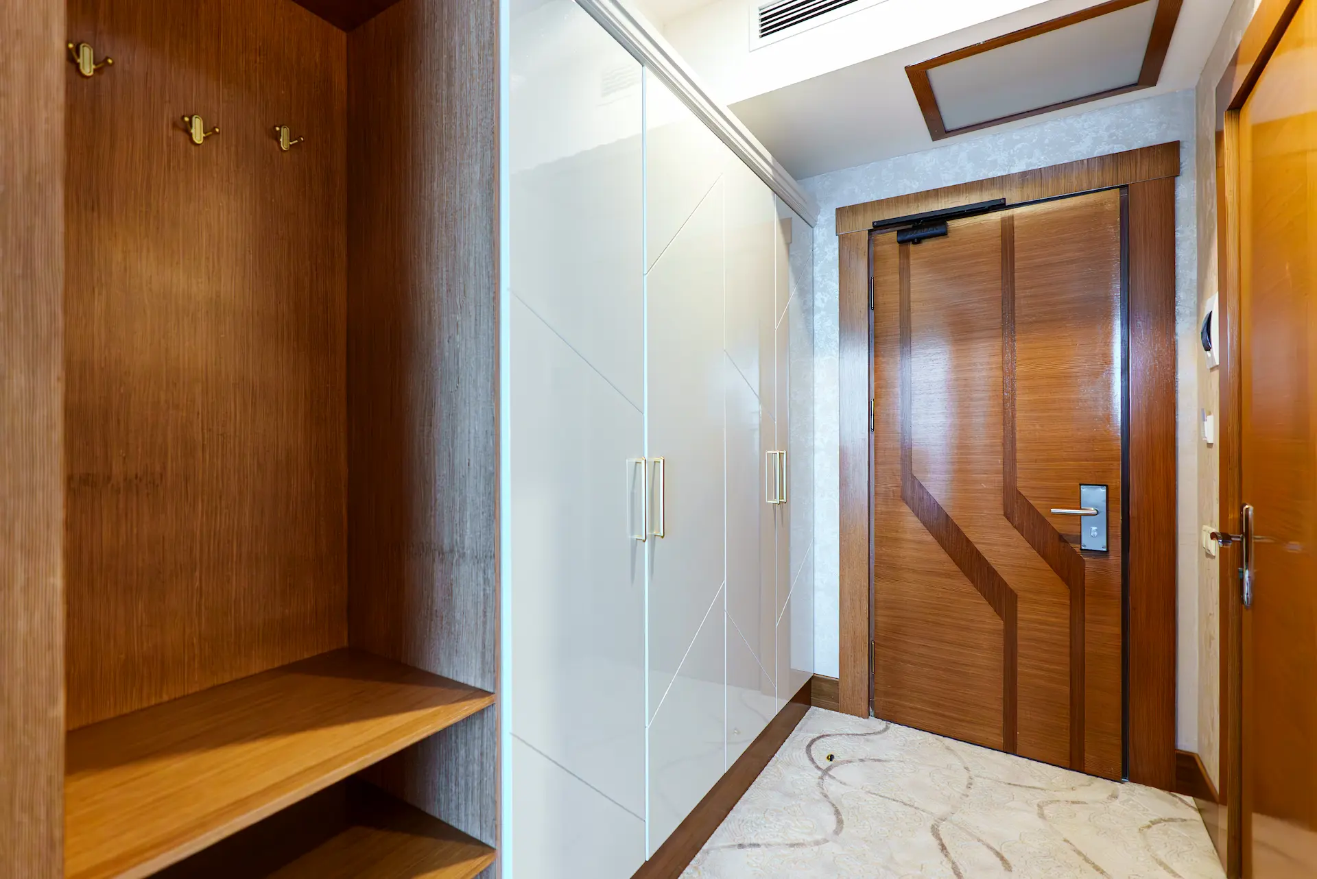 Мебель: Двуспальная кровать (220×200), диван, журнальный столик, шкаф для одежды, багажная тумба, вешалки, зеркало.