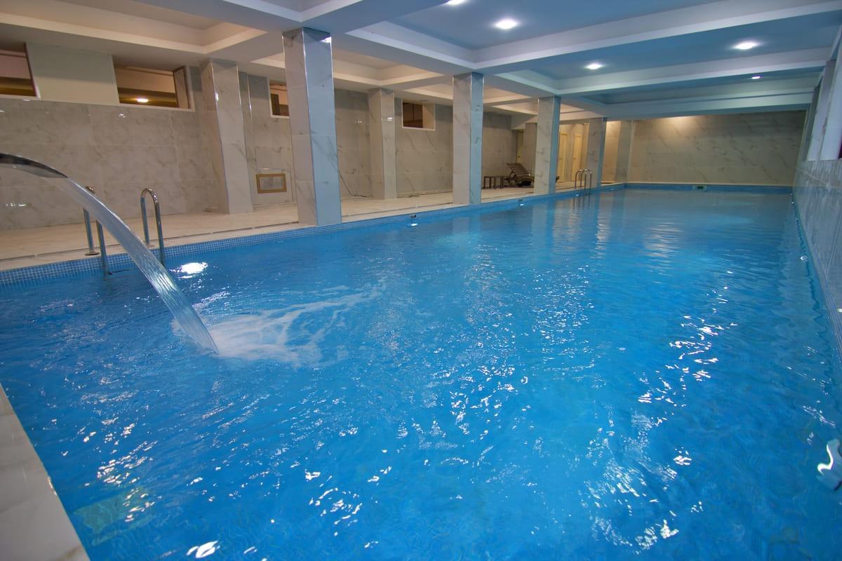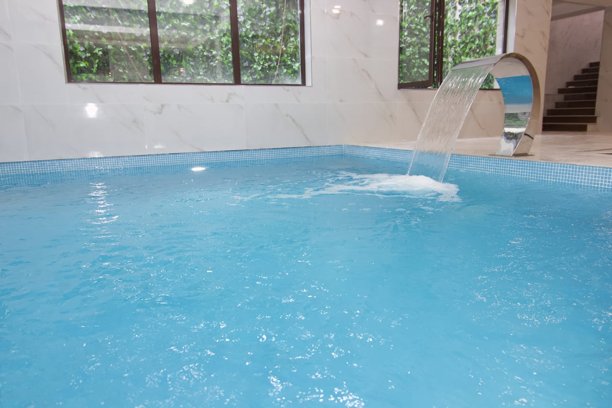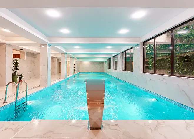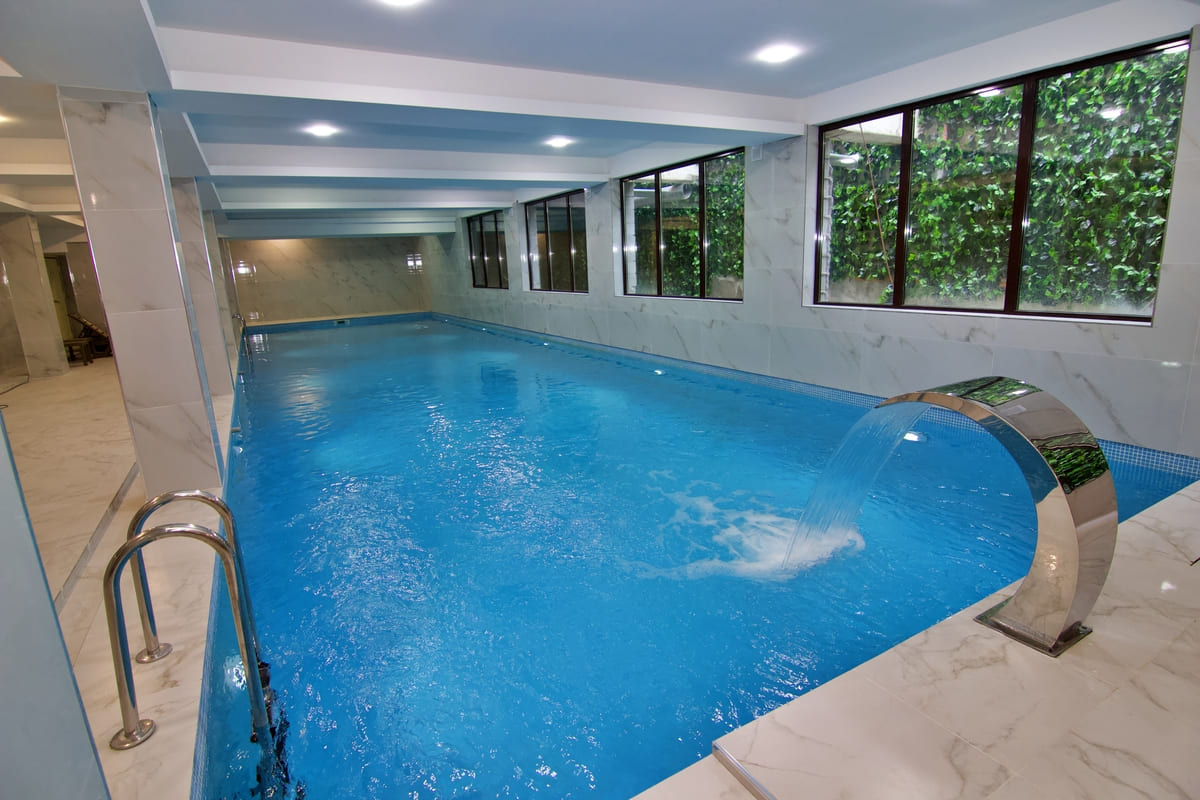 Водная зона: бассейн 23 метра с каскадным водопадом подарит ощущение свежести и легкости, а удобные шезлонги у воды позволят расслабиться под мягкий плеск воды.