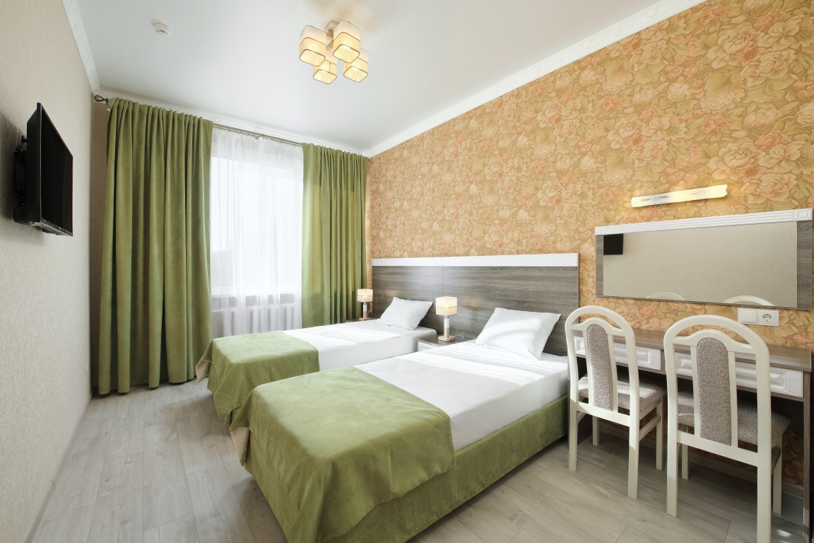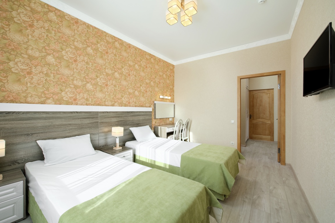 Мебель: Две односпальные кровати, платяной шкаф, две прикроватные тумбочки, туалетный столик, два стула.