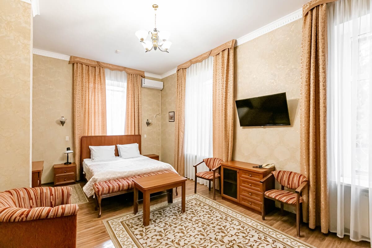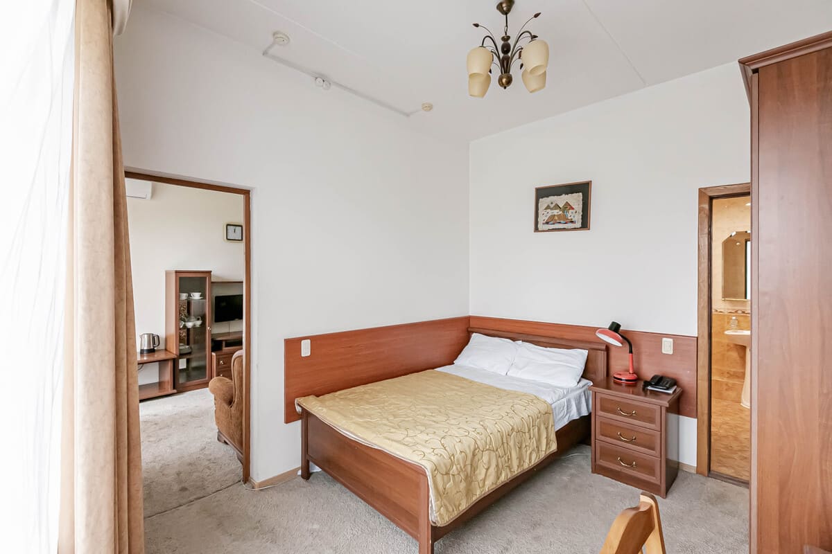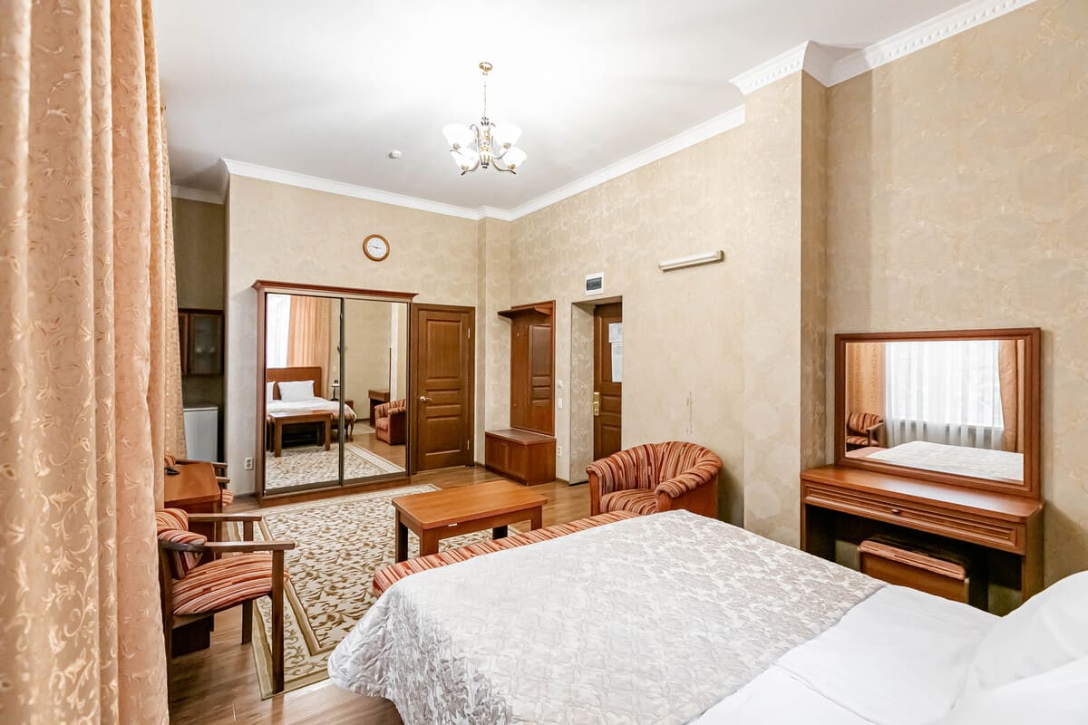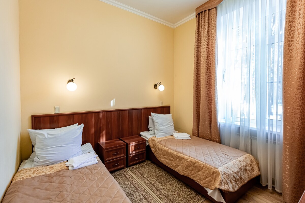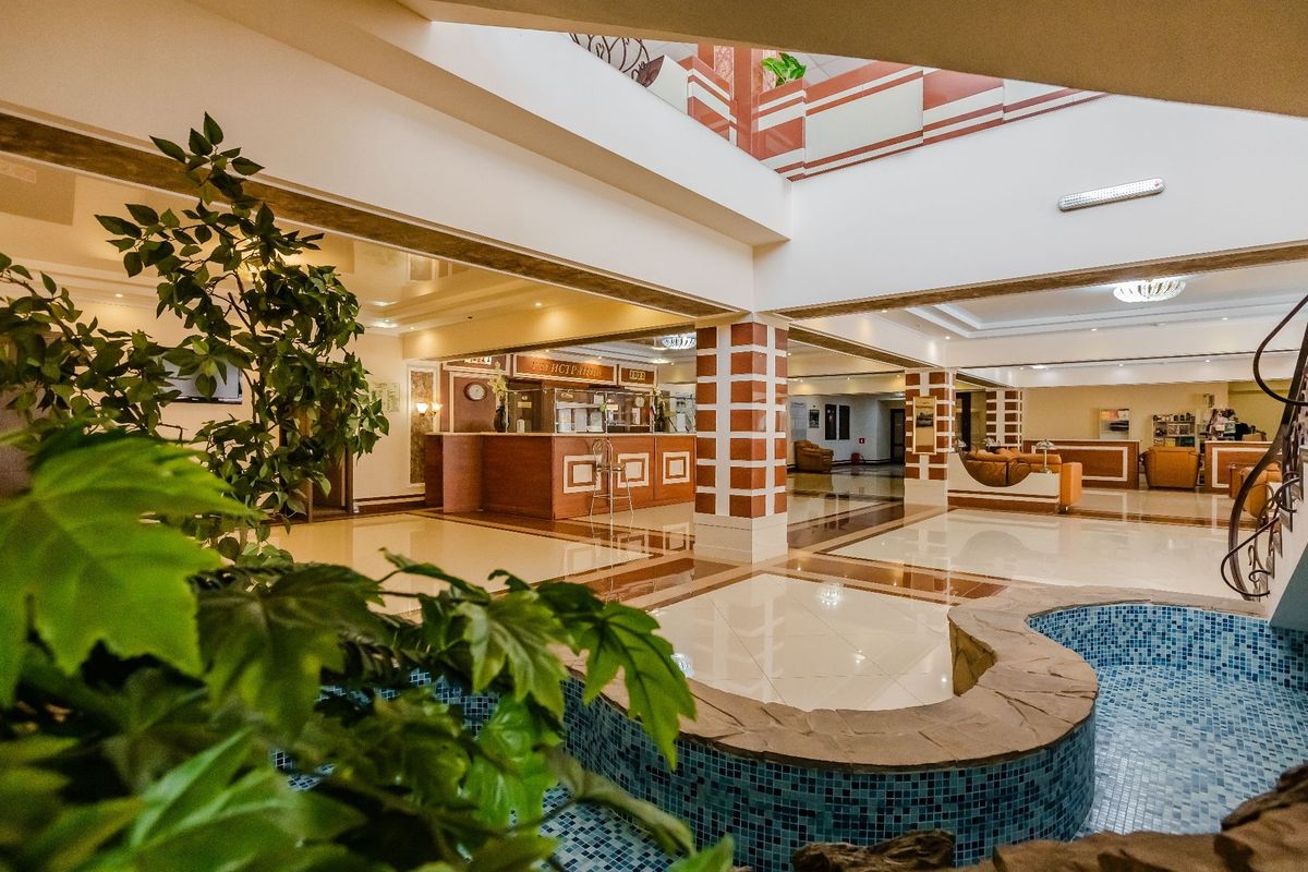 Санаторий располагает 240 номерами различных категорий, где созданы все условия для комфортного проживания. Просторные холлы, декорированные растениями, уютные зоны отдыха с мягкой мебелью создают атмосферу расслабления и спокойствия.