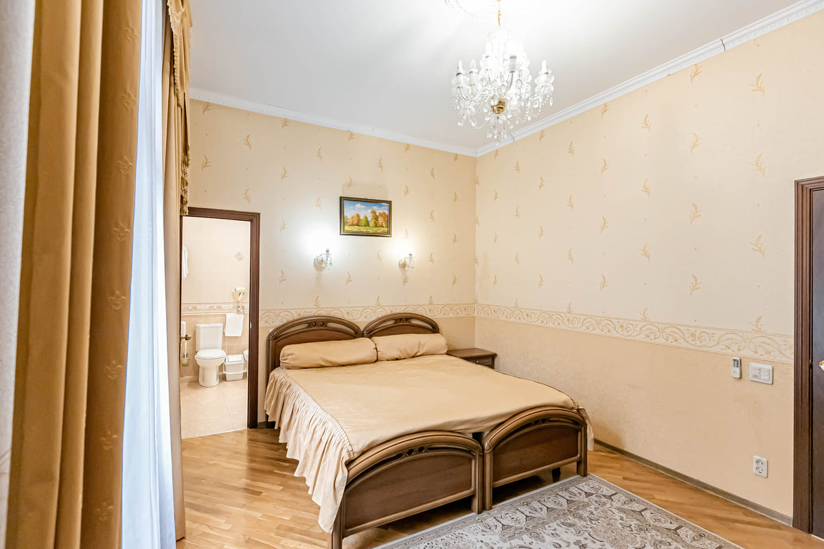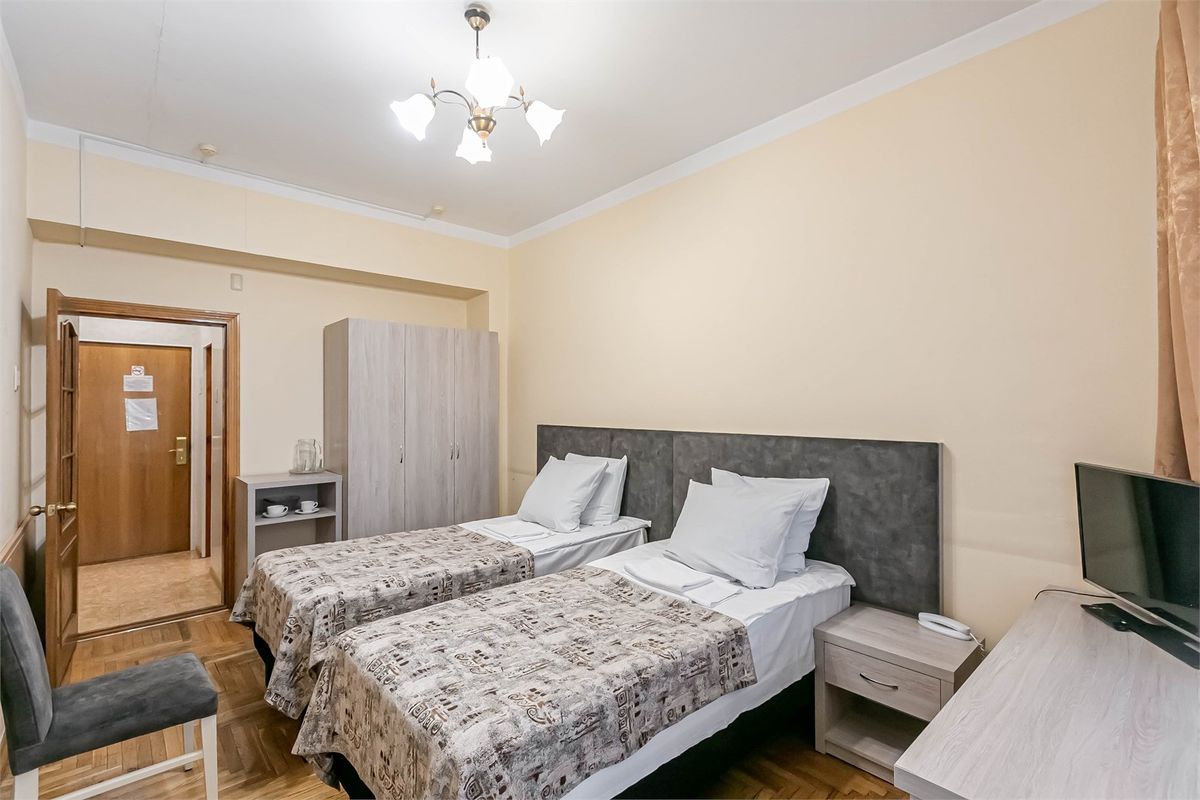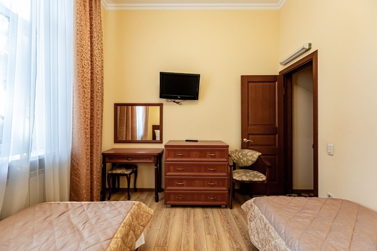 Мебель: Две отдельно стоящие кровати, шкаф, пристенный стол, 2 стула, зеркало.