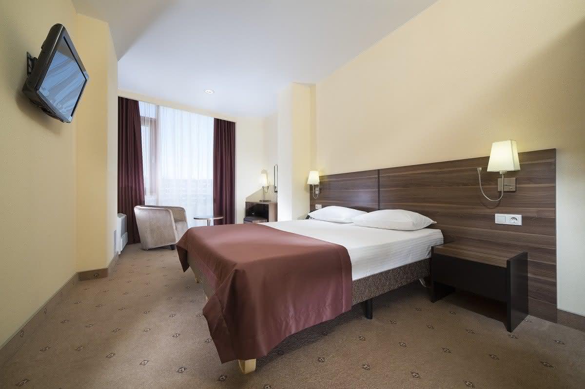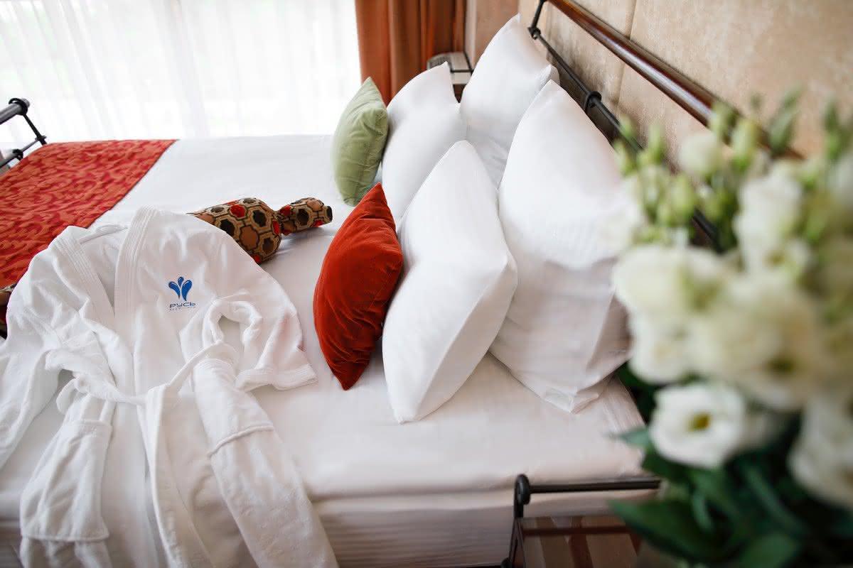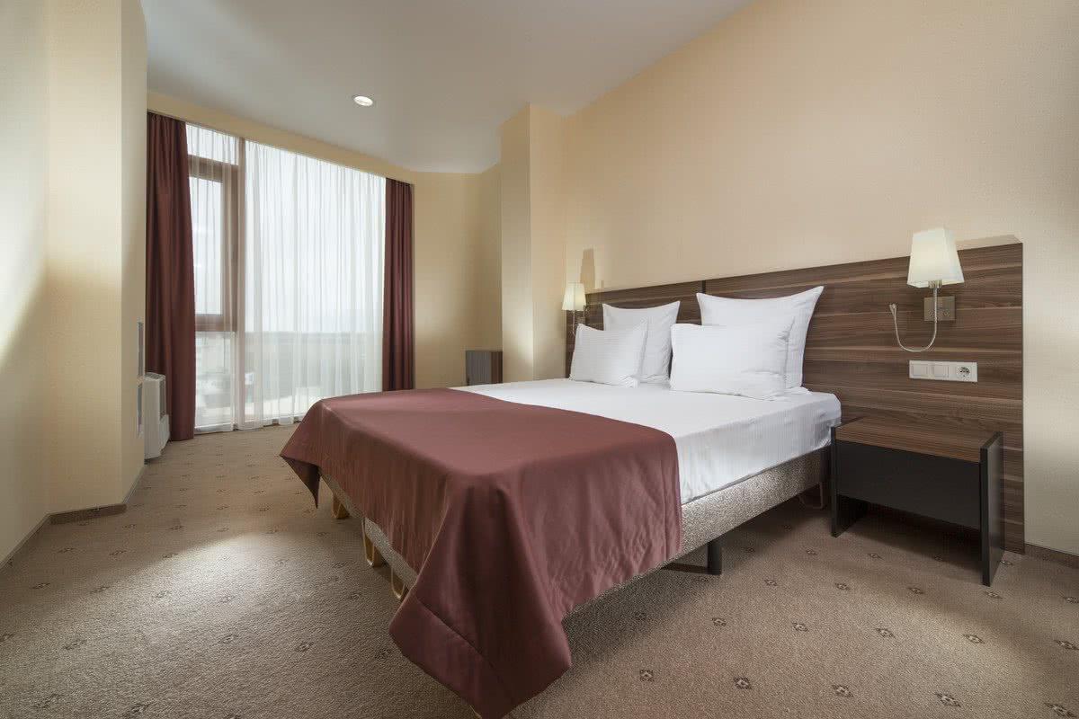 Мест в номере: Максимальная вместимость номера: 3 человека. Две односпальные или двуспальная кровать. Есть возможность установки детской кроватки.