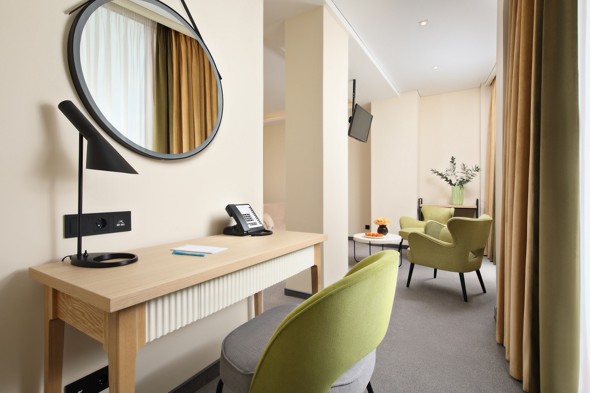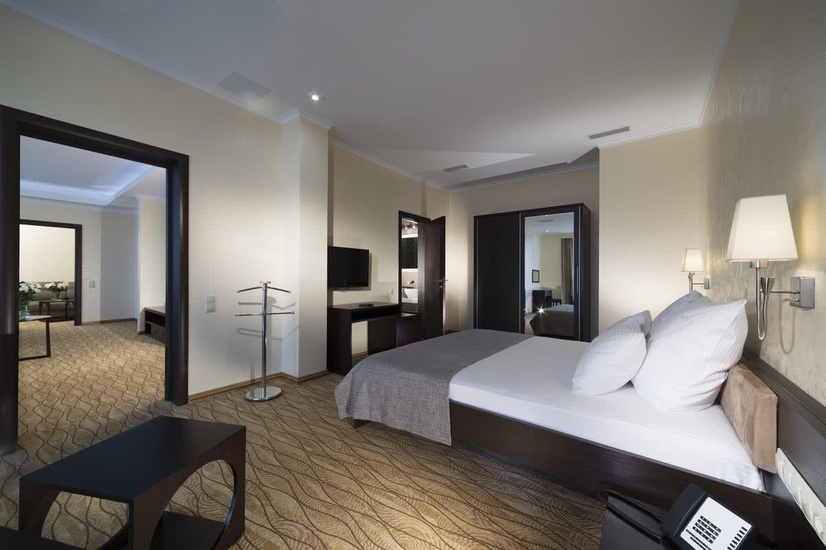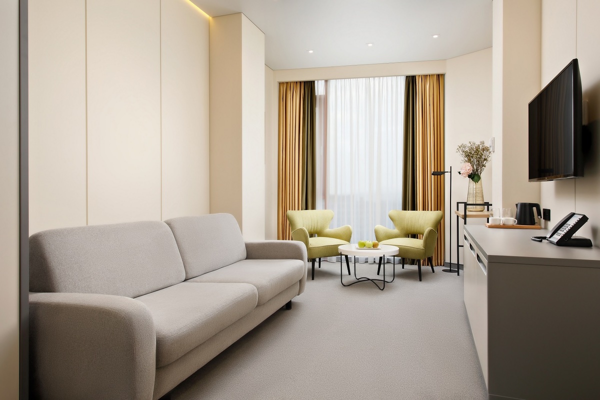 Мест в номере: Максимальная вместимость: 4 человека. Две односпальные или двуспальная кровать в спальне, раскладывающийся диван в гостиной. Есть возможность установки детской кроватки.