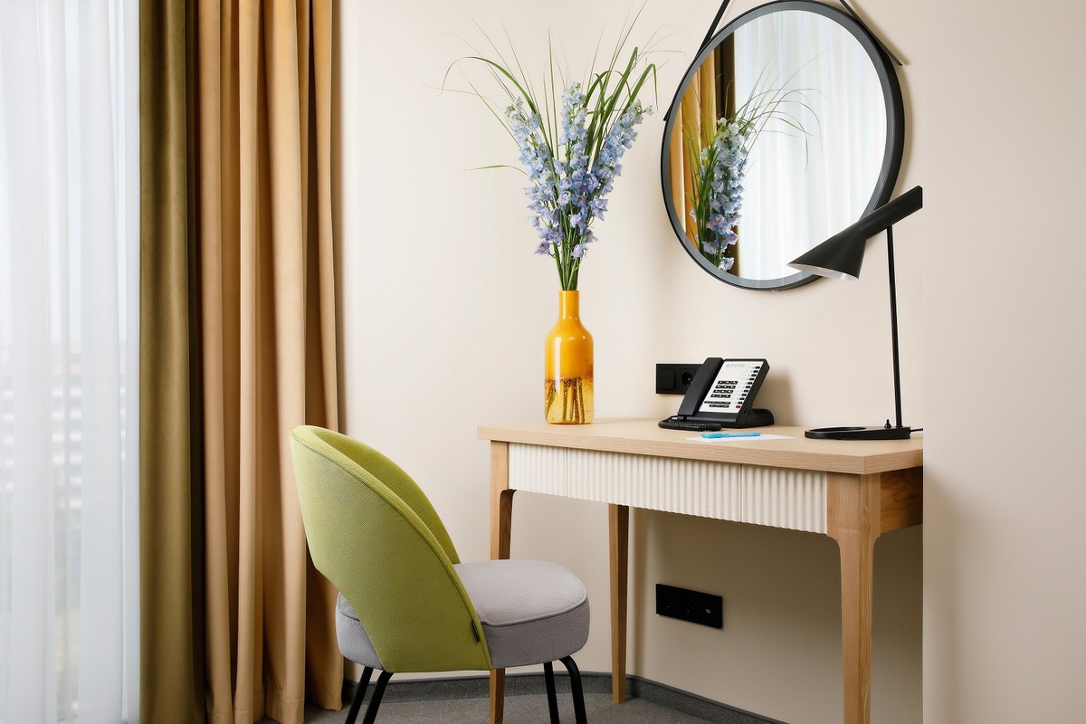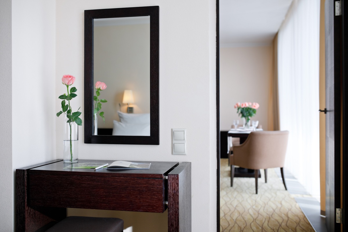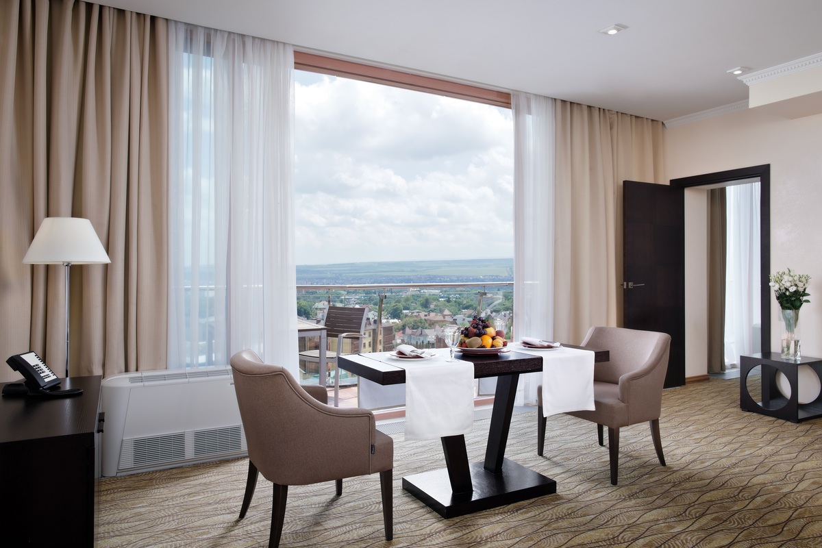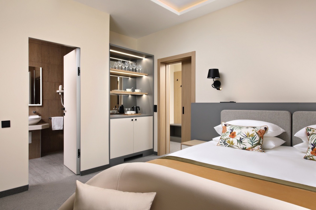 Мест в номере: Максимальная вместимость: 4 человека. Две односпальные или двуспальная кровать в спальне, раскладывающийся диван в гостиной. Есть возможность установки детской кроватки.