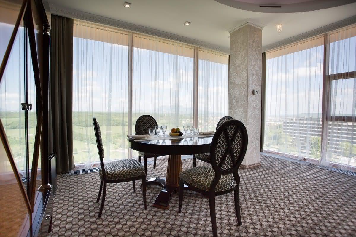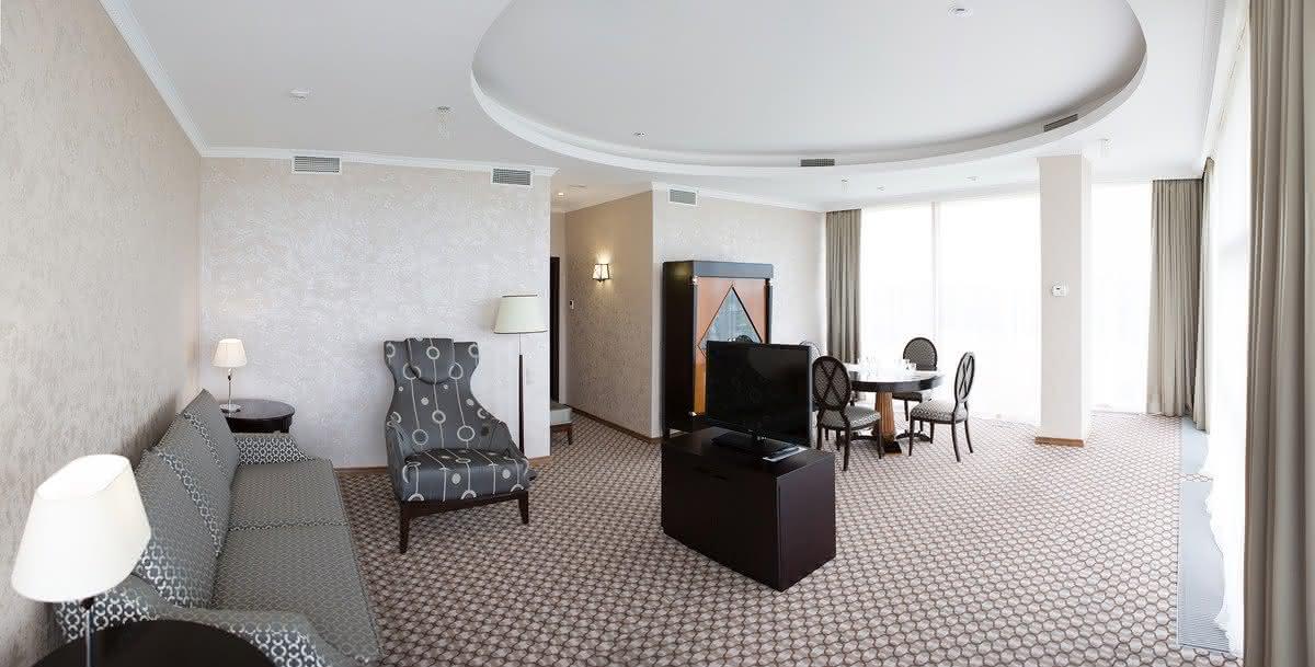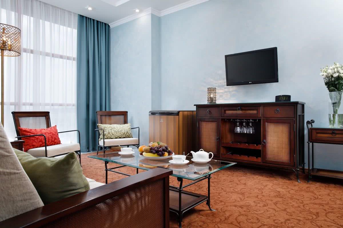 Оборудование: LED-телевизоры в спальне, гостиной и кабинете, мини-холодильник, электрочайник и набор посуды, чайный набор, индивидуальная система кондиционирования воздуха.