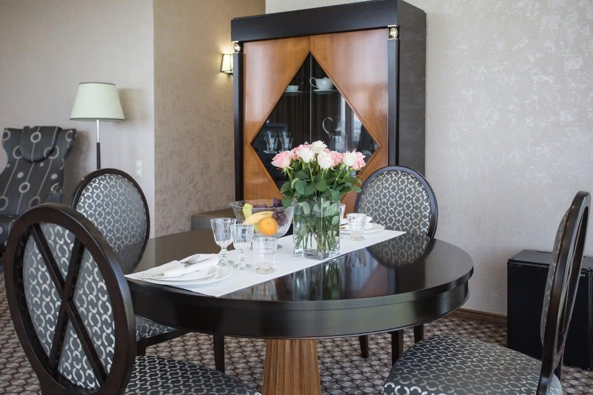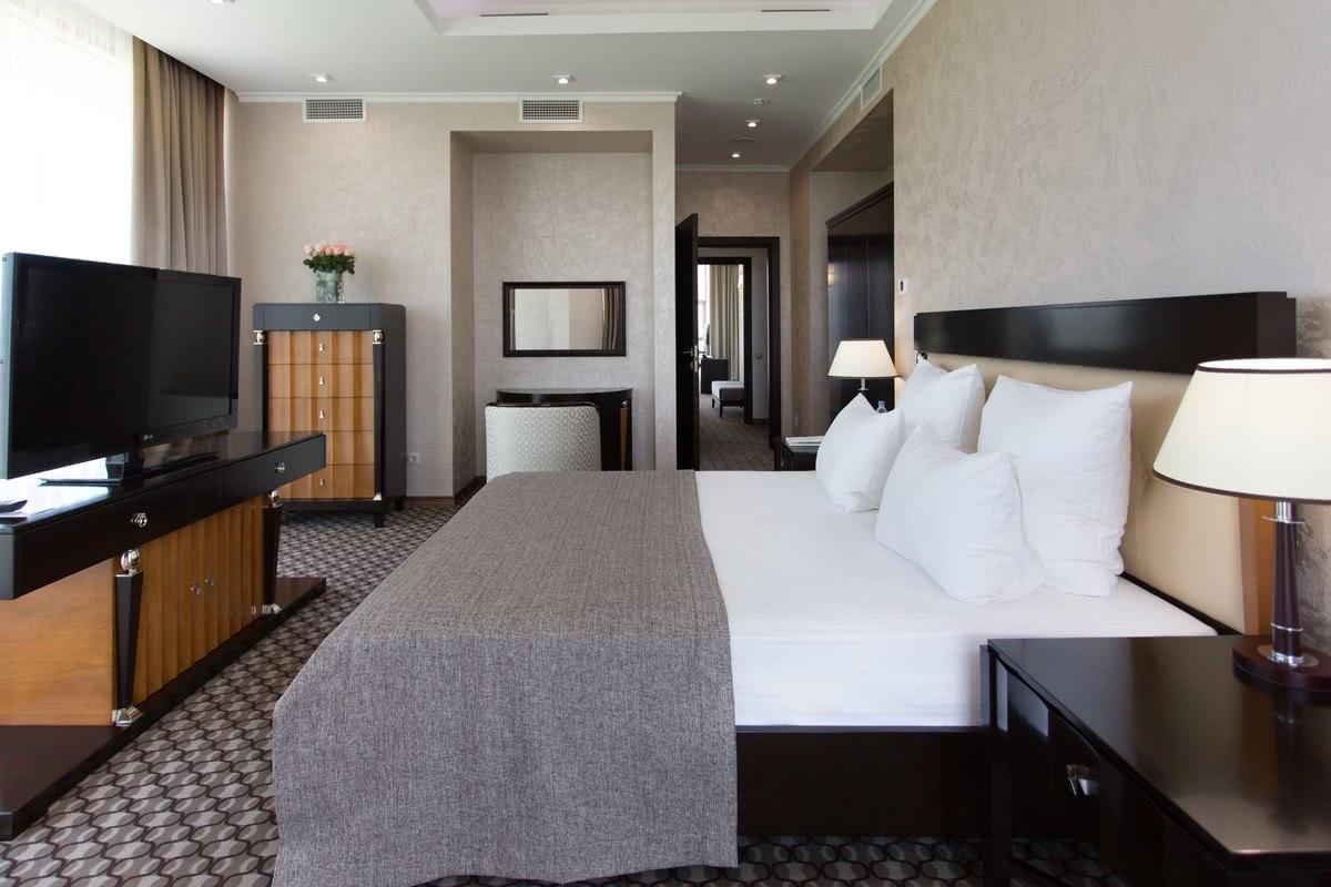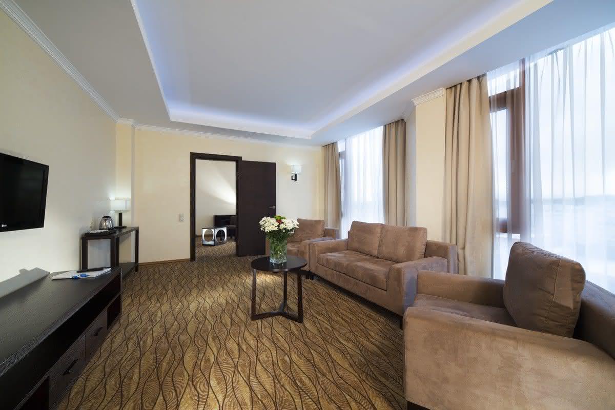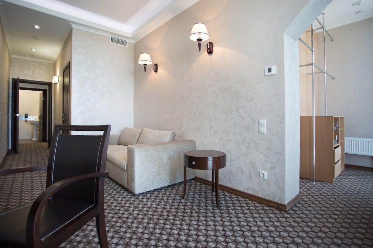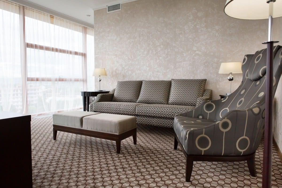 Мест в номере: Максимальная вместимость: 4 человека. Большая двуспальная кровать King Size в спальне, раскладывающийся диван в гостиной. Есть возможность установки детской кроватки.