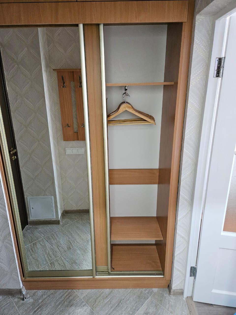 Мебель: вешалка, зеркало, кровать односпальная, прикроватная тумбочка, стол, стул, шкаф.