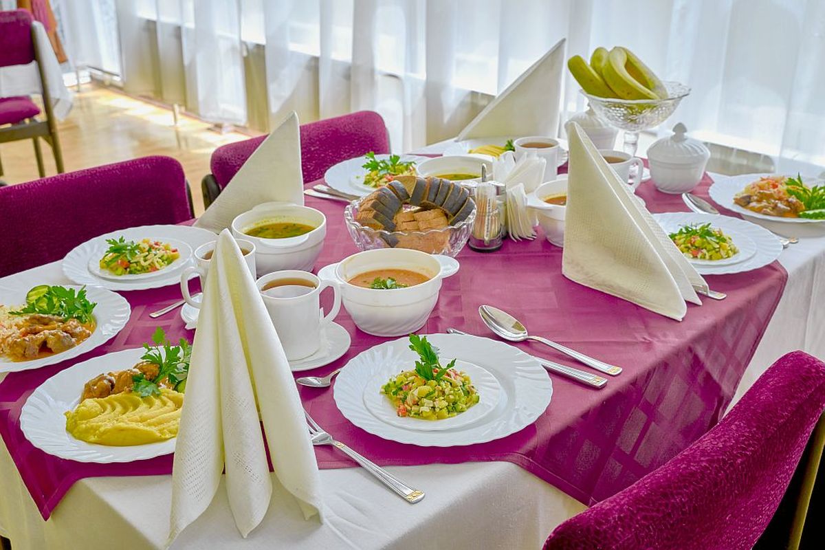 Для гостей без специальных медицинских показаний предусмотрен общий стол. Для отдыхающих с пищевой аллергией или индивидуальной непереносимостью продуктов разрабатывается персональное меню. Такой рацион является сбалансированным, исключает неподходящие продукты и учитывает вкусовые предпочтения.
