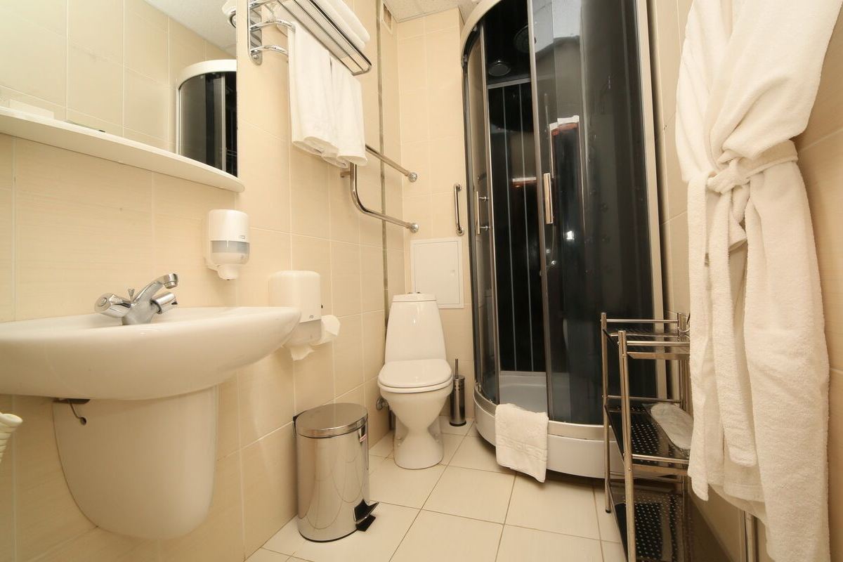 Санузел: Душевая кабина, умывальник, унитаз, фен, косметическое зеркало, комплект полотенец, халат, тапочки, индивидуальные косметические наборы.
