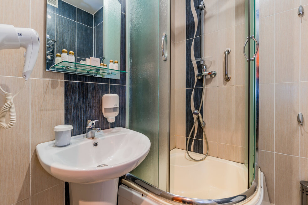 Санузел: с душевой кабиной, тапочки, туалетные принадлежности, фен.