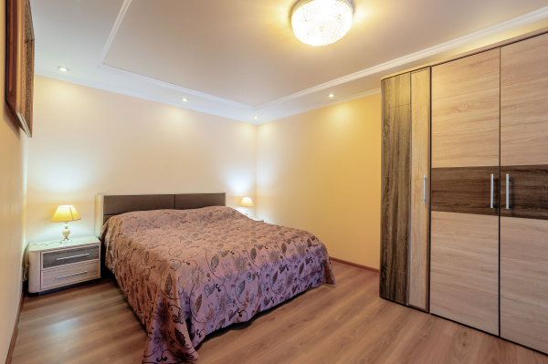 Мебель: Двуспальная кровать (180×200 см), шкаф, 2 тумбы, мягкая мебель в гостиной, обеденная группа.