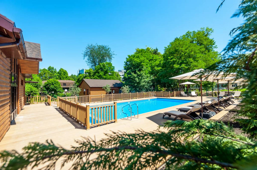 На территории санатория в коттеджном комплексе расположен открытый бассейн (12×6 метров, глубина 1,45 метра), с зоной отдыха с шезлонгами и пляжными зонтами. Для самых маленьких гостей предусмотрен отдельный надувной бассейн с игровыми элементами, где дети могут безопасно плескаться под присмотром взрослых. Температура воды поддерживается на комфортном уровне не ниже +26°C.