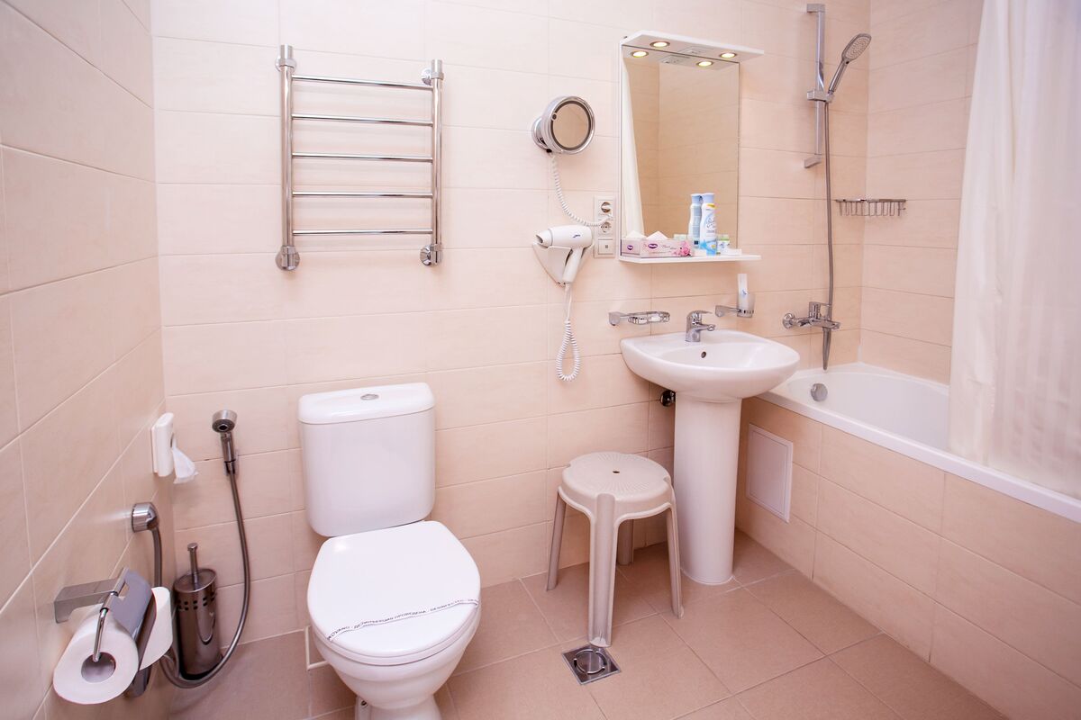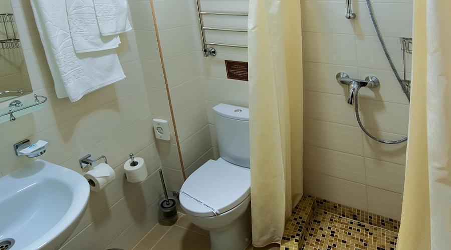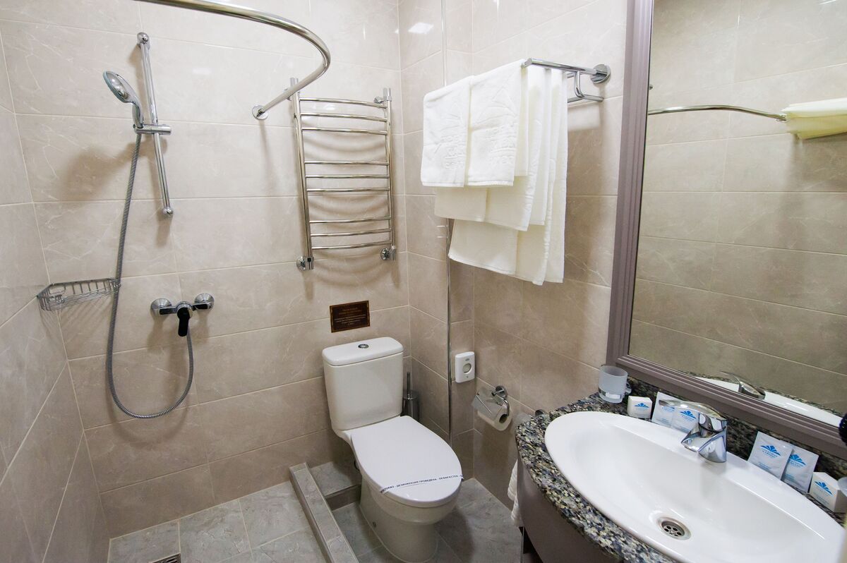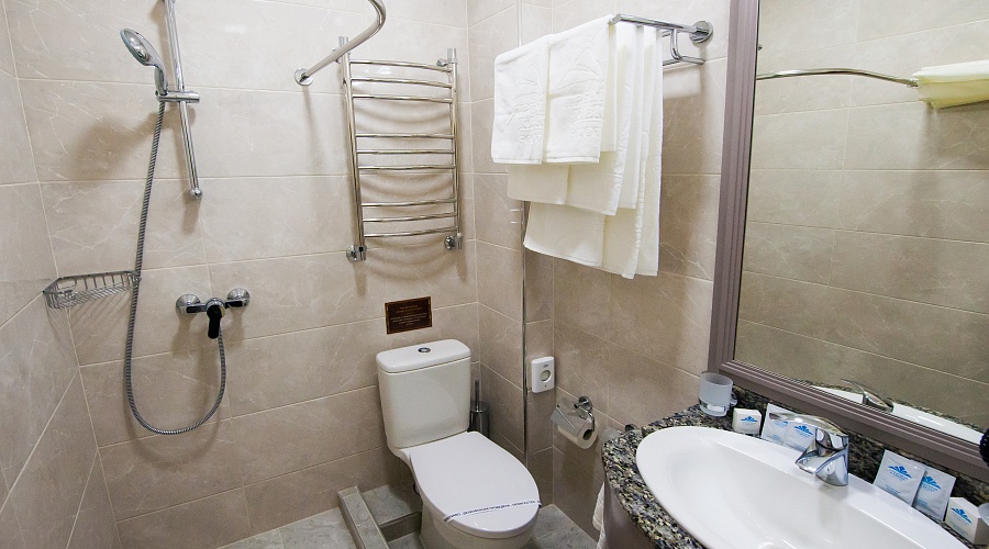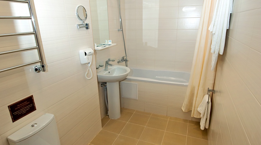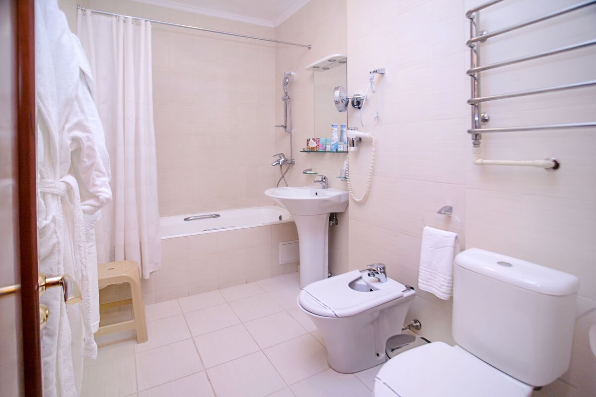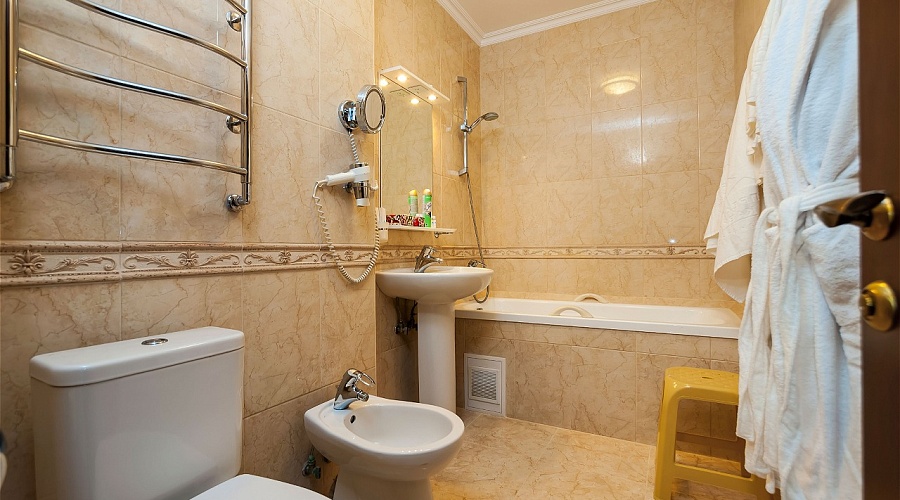 Санузел: Совмещенный (ванна/душевая кабина, туалет, биде, раковина). Укомплектован банными принадлежностями (халат, тапочки), гигиеническим набором (шампунь, гель, мыло, шапочка) и феном.