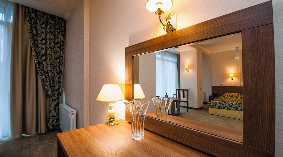 Мебель: Двуспальная кровать (160x200 см), диван, туалетный стол с пуфиком, гардероб, тумба для багажа, зеркало.