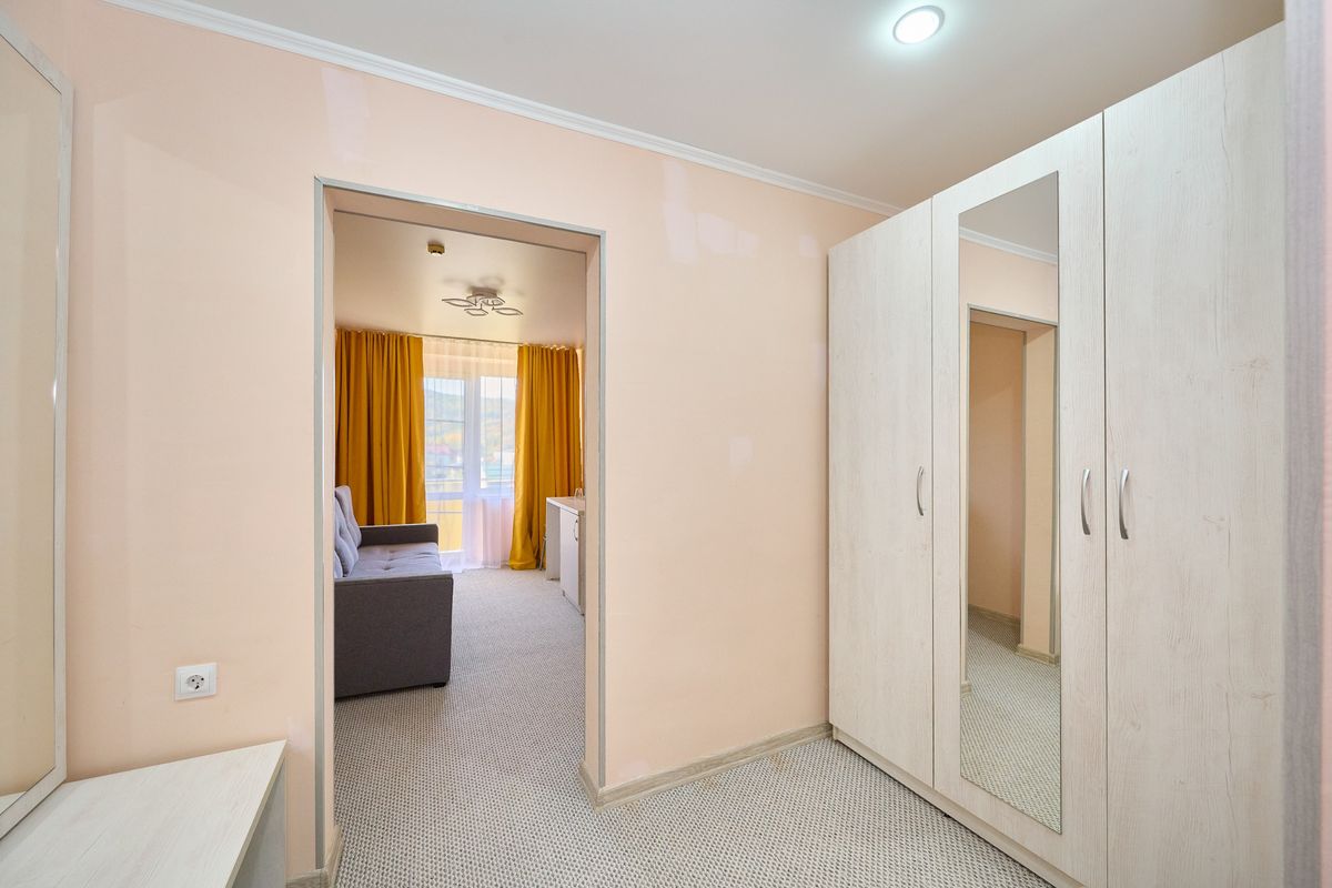 Мебель: Вместительный гардероб, тумба под багаж, двуспальная кровать (180×200 см), раскладной диван, письменный стол, стулья, прикроватные тумбы.
