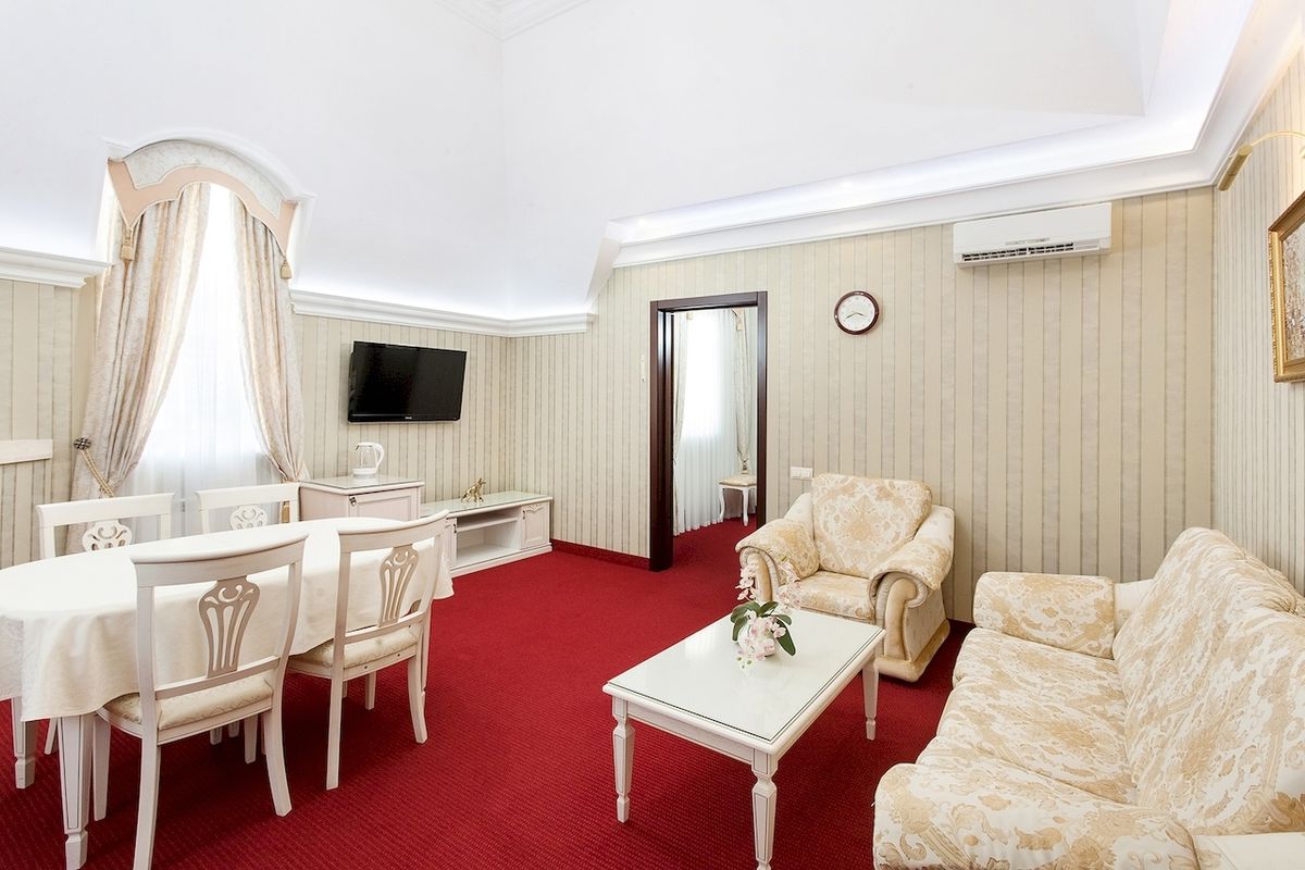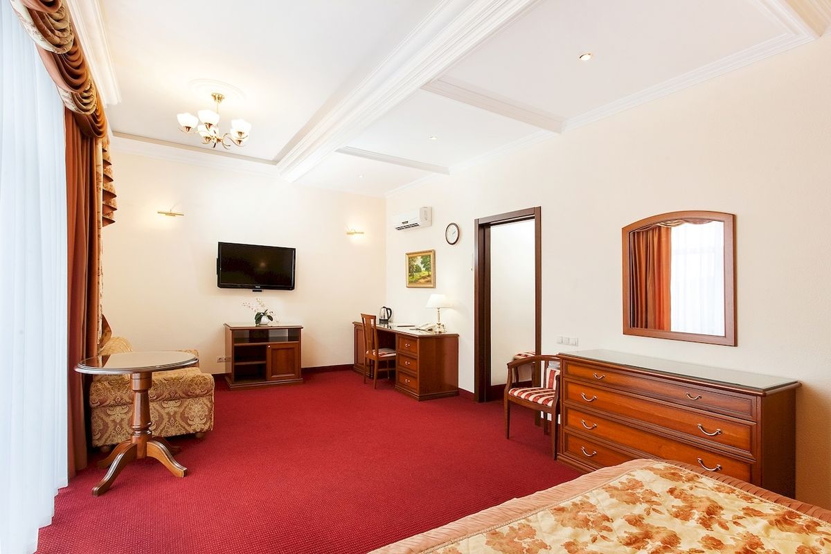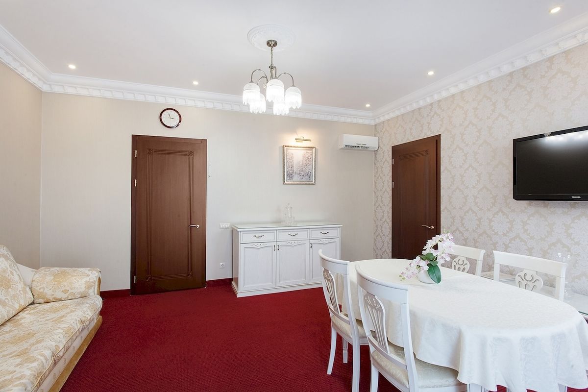 Оборудование: Два настенных телевизора, холодильник, две сплит-системы, телефон, электрочайник, посуда, сейф, фен, настольные лампы, ковровое покрытие, картины, вазы, фраже.