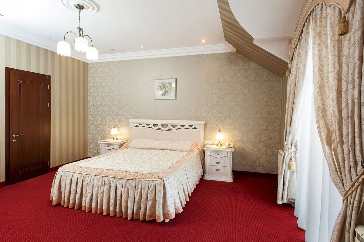 Мебель: Две односпальные кровати или одна двуспальная кровать, прикроватные тумбочки, шкаф, стул, пуфик.