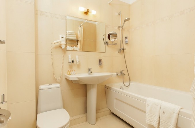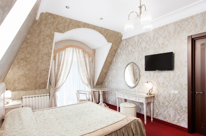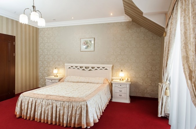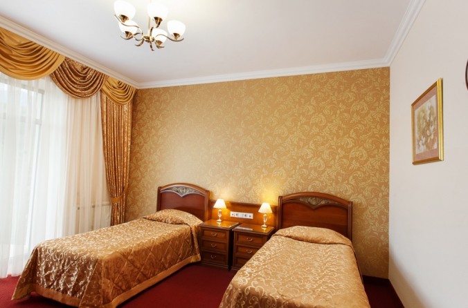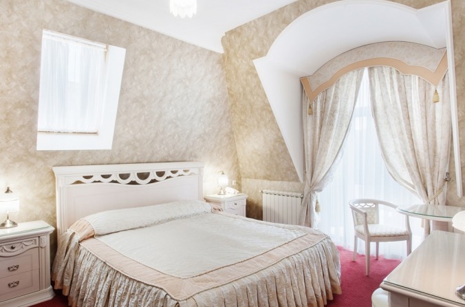 Мебель: Две односпальные кровати или одна двуспальная кровать, прикроватные тумбочки, шкаф, стул, пуфик.