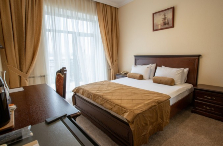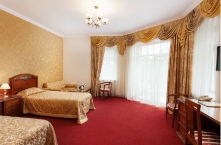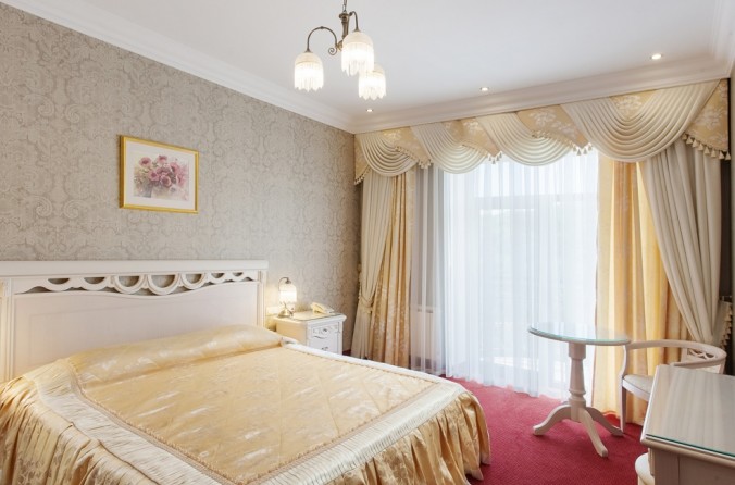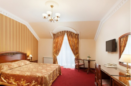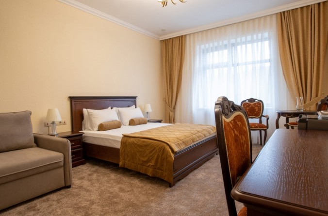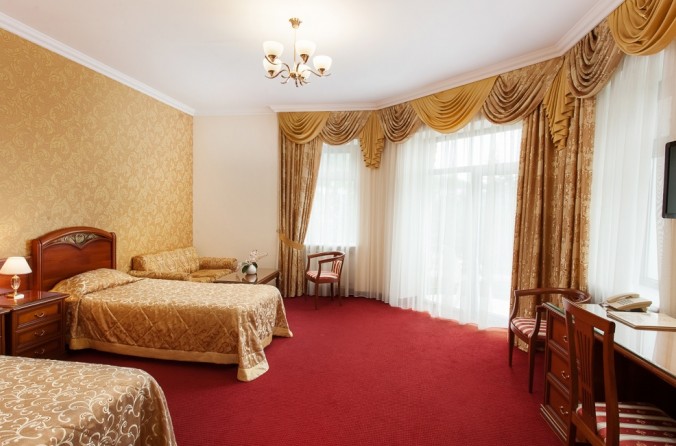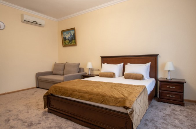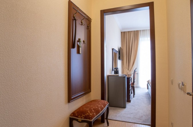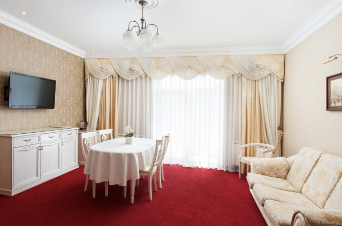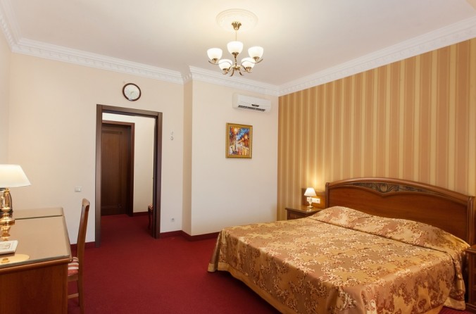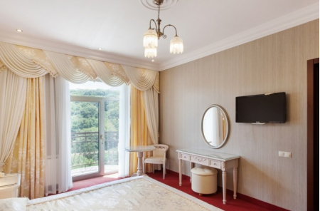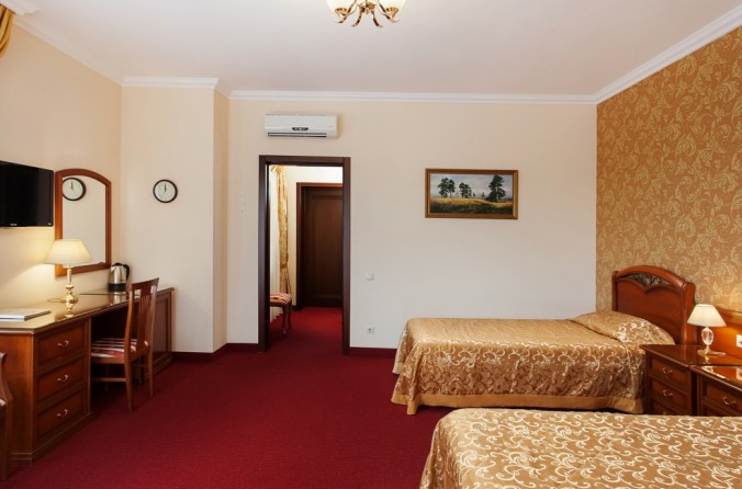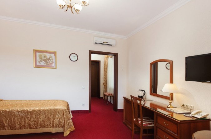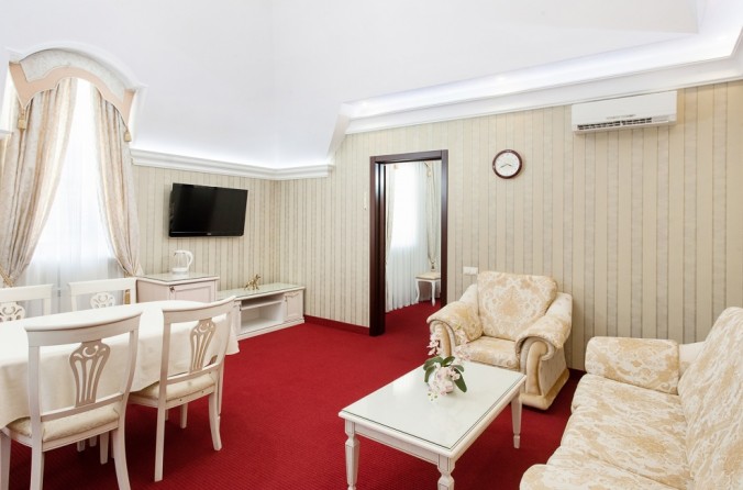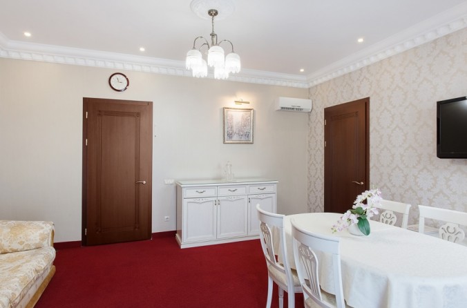 Оборудование: Два настенных телевизора, холодильник, две сплит-системы, телефон, электрочайник, посуда, сейф, фен, настольные лампы, ковровое покрытие, картины, вазы, фраже.
