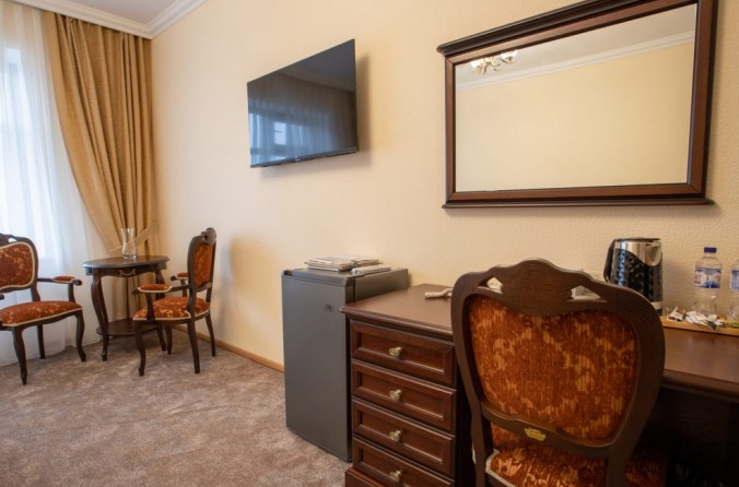 Оборудование: Настенный телевизор, холодильник, сплит-система, электрочайник, посуда, сейф, фен, настольные лампы, ковровое покрытие, картины, вазы, фраже.