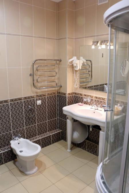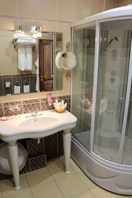 Санузел: Душ, гигиенические средства (зубная паста, зубная щетка, косметический набор, бритвенный набор, швейный набор, шампунь, кондиционер для волос, гель, лосьон, туалетное мыло, шапочка ванная).