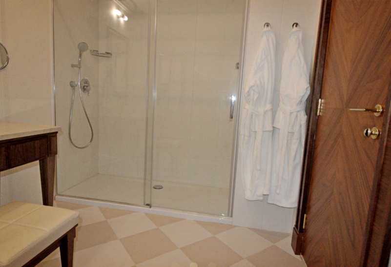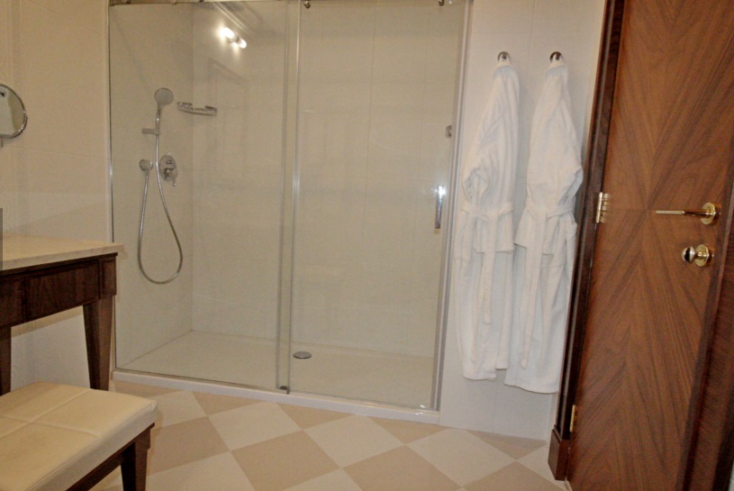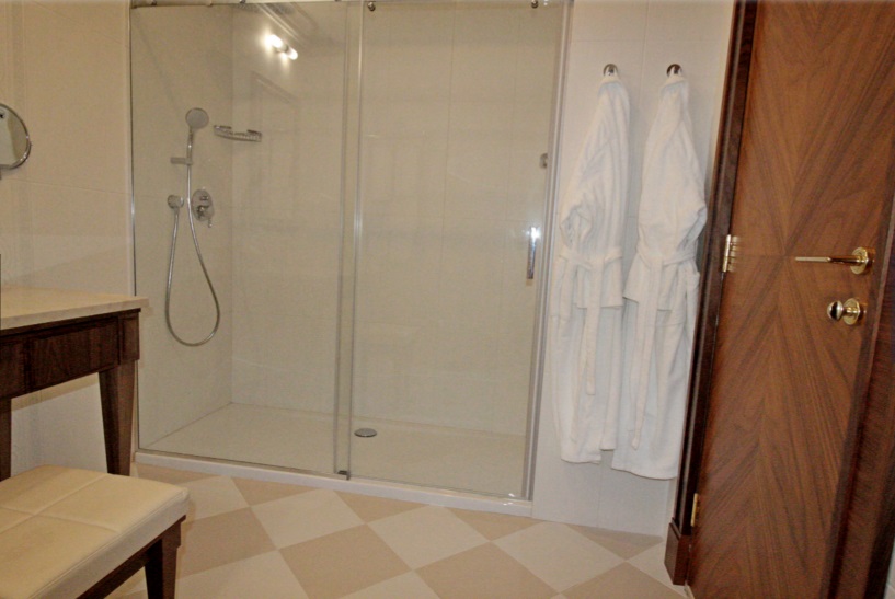 Санузел: с душевой кабиной, тапочки, туалетные принадлежности, фен, халат.