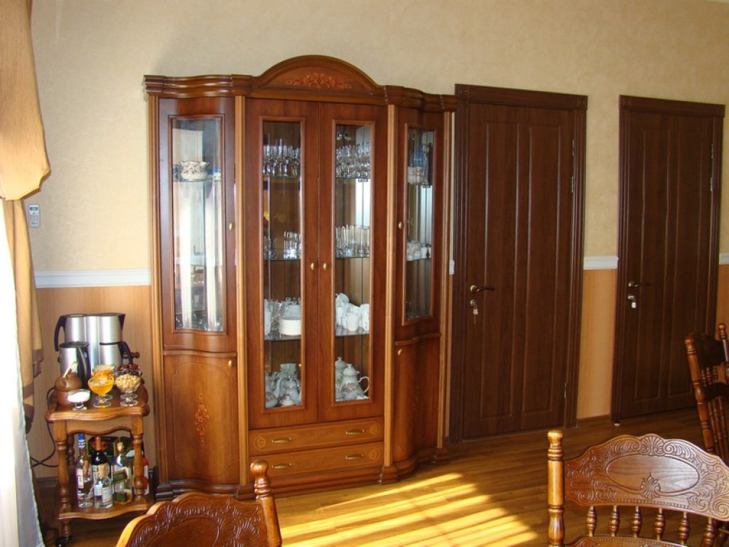 Мебель: вешалка, диван раскладной, зеркало, кровать двуспальная: 2, кухонная мебель, прикроватные тумбочки, стол, стулья, тумба, шкаф-купе.