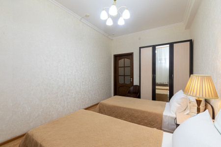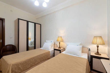 Мебель: 2 односпальные кровати, прикроватные тумбочки, столик журнальный, стулья, шкаф, вешалка, зеркало, настольная лампа/светильник.