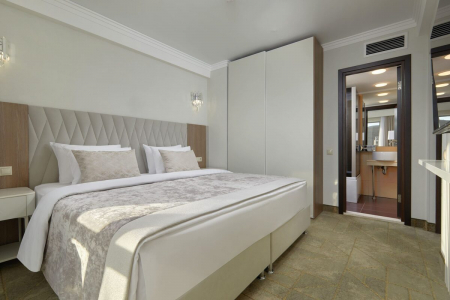 Мебель: Двуспальная кровать или две односпальные кровати, туалетный столик, стул, пуфик, кофейный столик, две прикроватные тумбочки, шкаф-купе, шторы блэкаут.