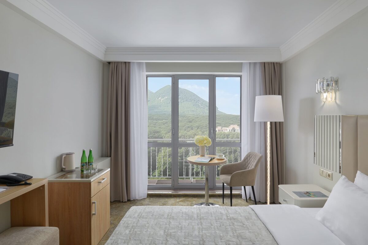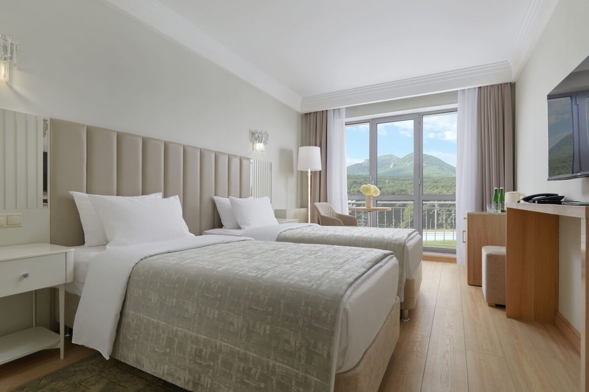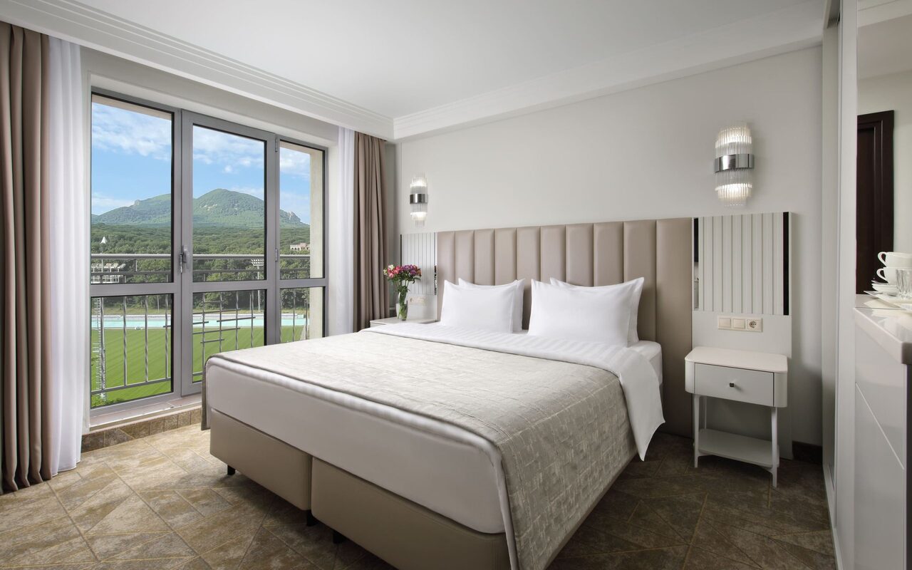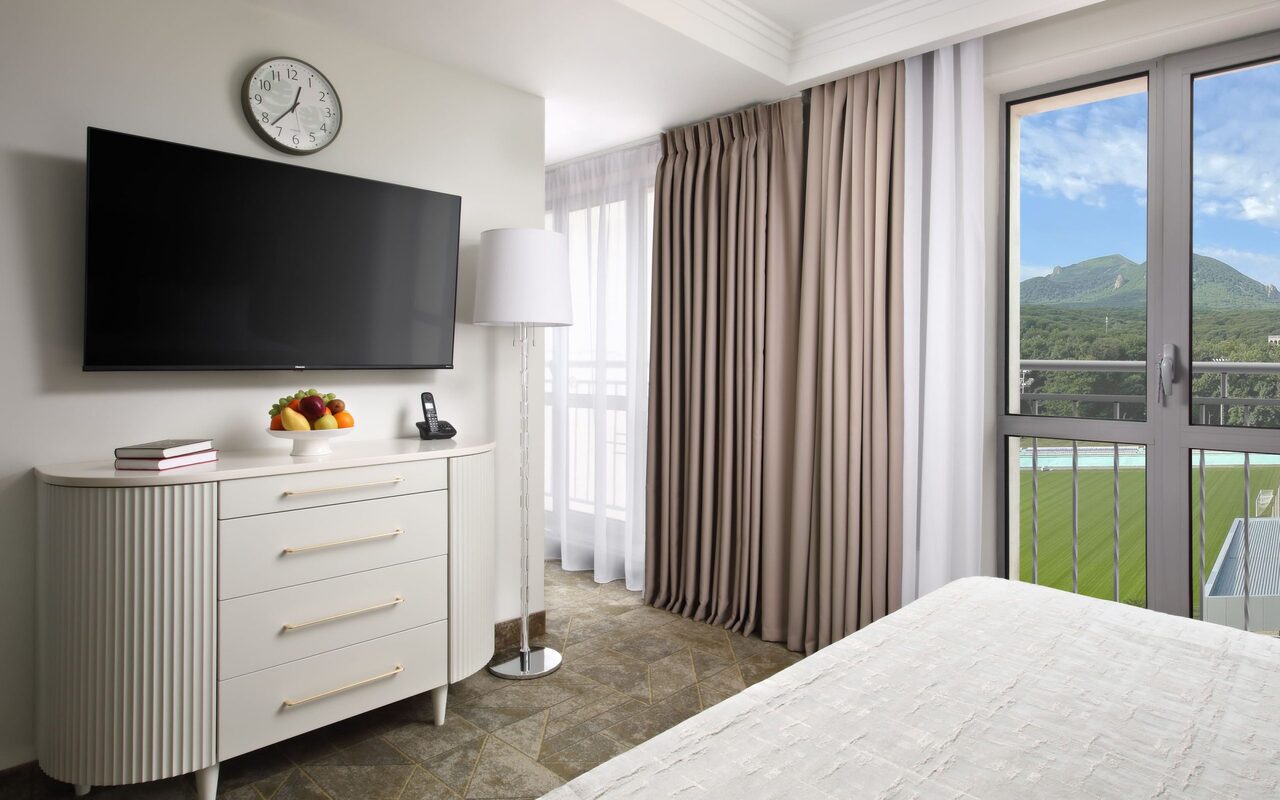 Мебель: Двуспальная кровать или две односпальные кровати, туалетный столик, стул, пуфик, кофейный столик, две прикроватные тумбочки, шкаф-купе, шторы блэкаут.