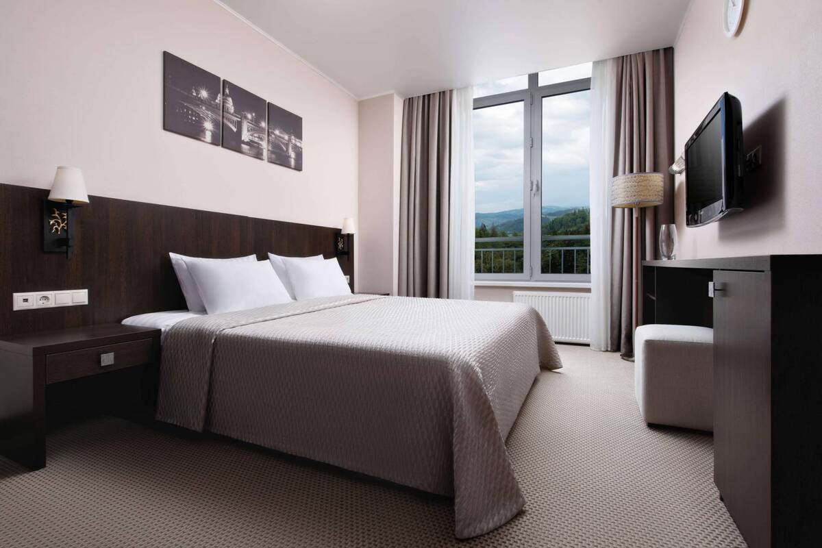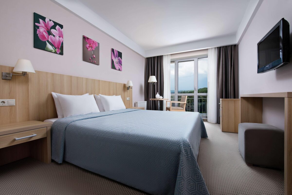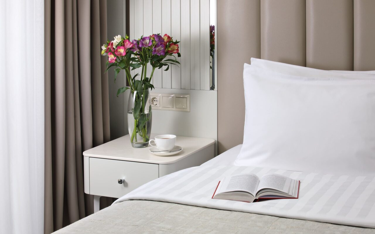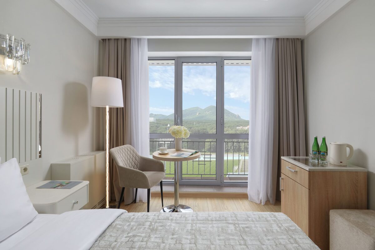 Мебель: Двуспальная кровать или две односпальные кровати, туалетный столик, стул, пуфик, кофейный столик, две прикроватные тумбочки, шкаф-купе, шторы блэкаут.
