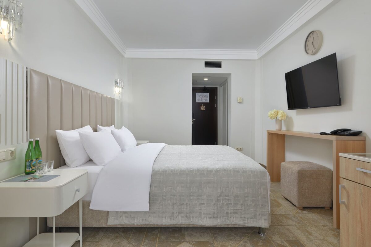 Оборудование: Телевизор (30 каналов), мини-бар, телефон, сейф, система кондиционирования, электрический чайник, чайный набор, фен, индивидуальное ночное освещение, настольная лампа, торшер, индивидуальные розетки, интернет Wi-Fi.