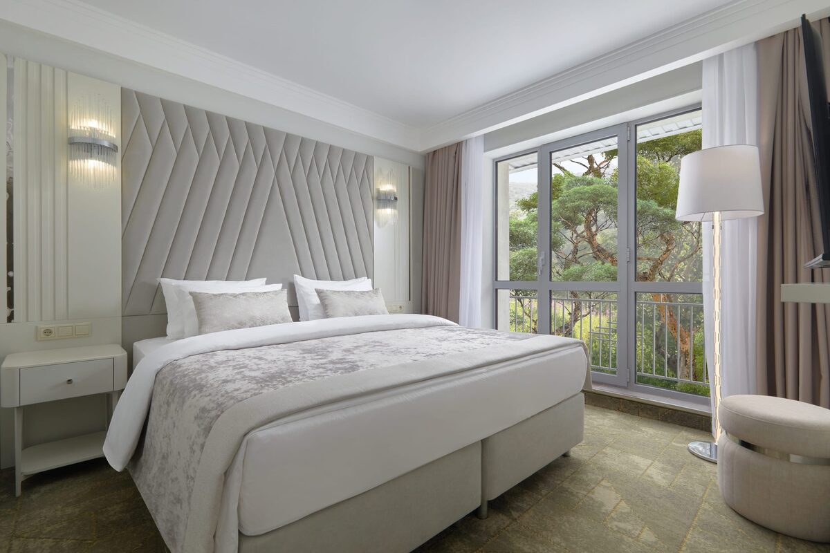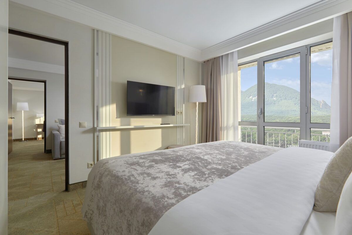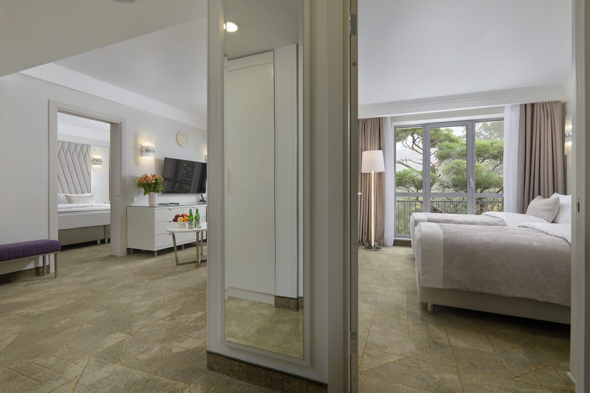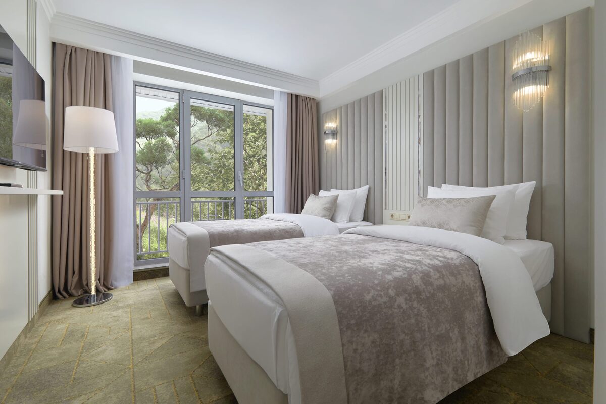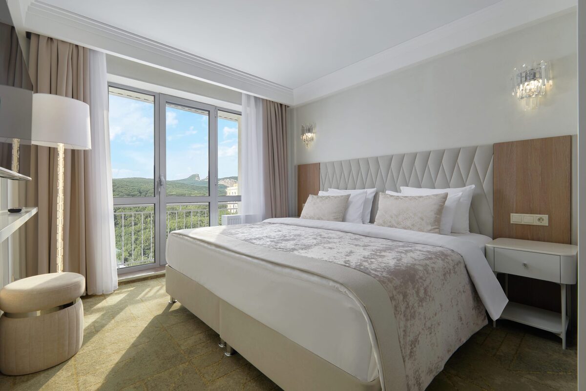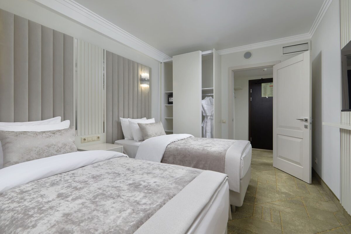 Мебель: Двуспальная кровать, две односпальные кровати, раскладывающийся диван, журнальный стол, стул, два пуфика, два туалетных столика, четыре прикроватные тумбочки, шкаф-купе, косметическое зеркало, шторы блэкаут.
