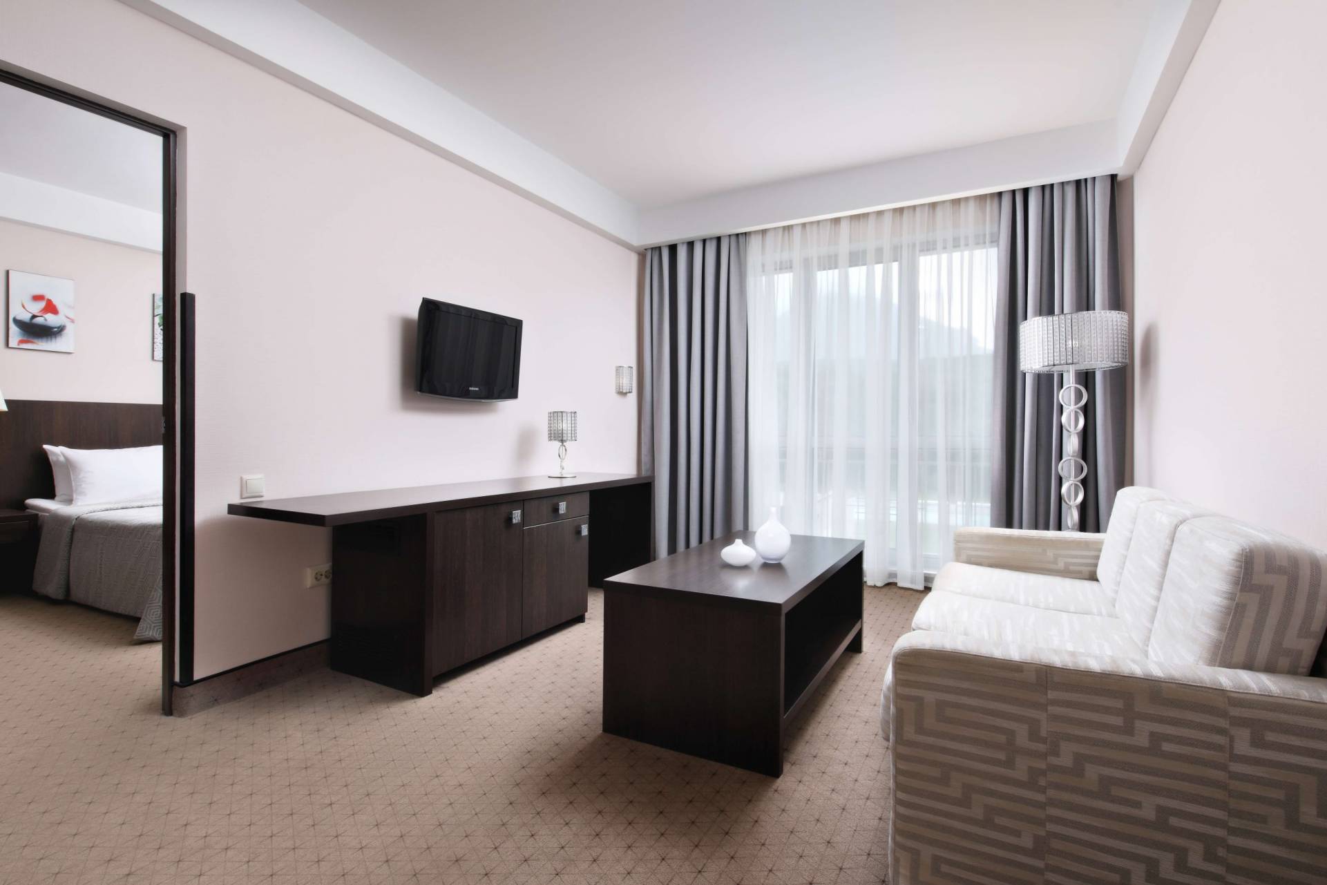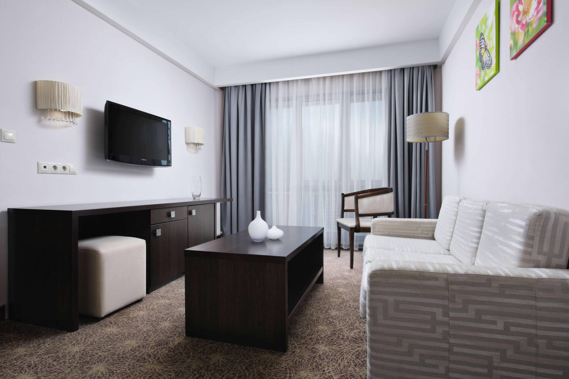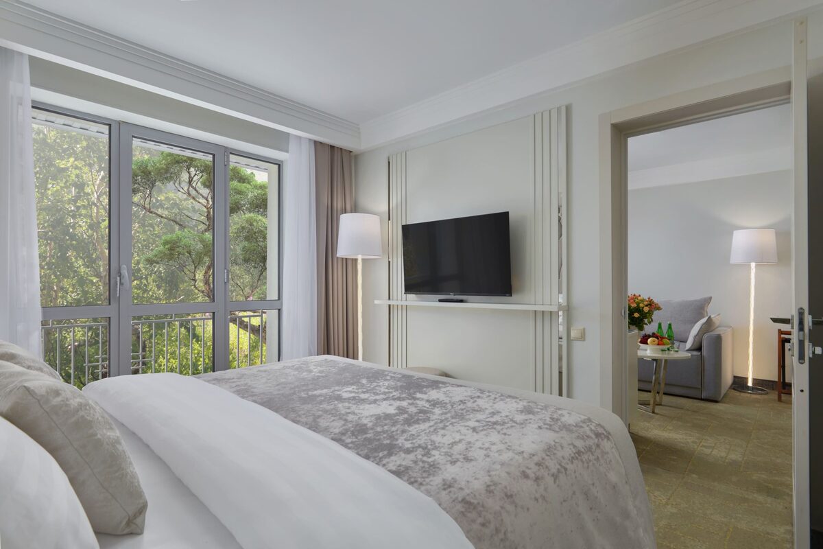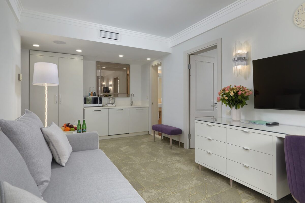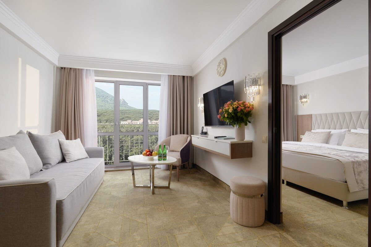 Мебель: Двуспальная кровать, две односпальные кровати, раскладывающийся диван, журнальный стол, стул, два пуфика, два туалетных столика, четыре прикроватные тумбочки, шкаф-купе, косметическое зеркало, шторы блэкаут.