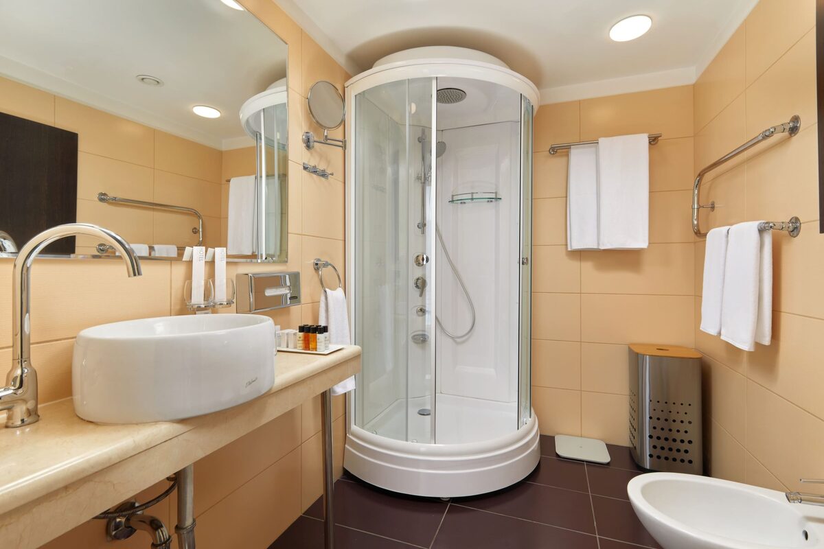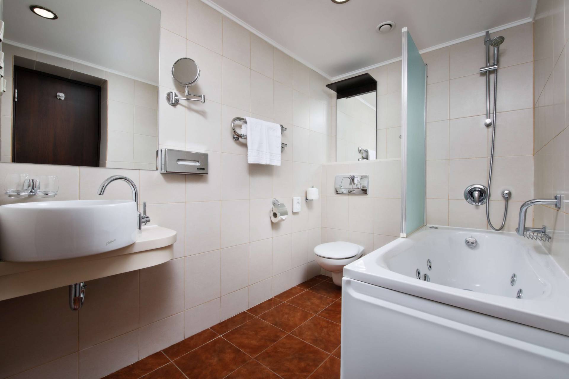 Санузел: Ванная комната с джакузи или душевой кабиной, косметический набор.