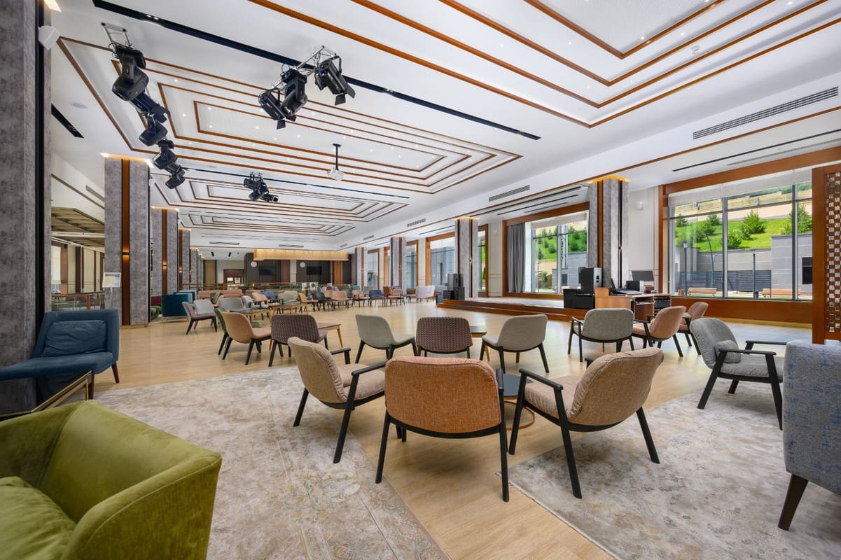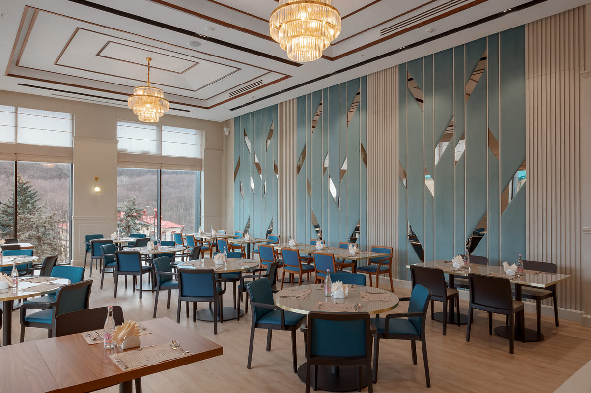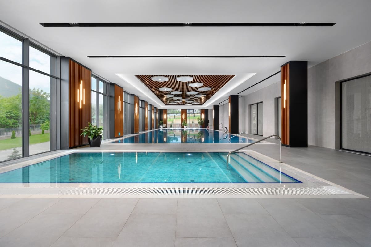 Современный акватермальный комплекс: просторный бассейн 20×9 м с системой гидромассажа, финскую сауну, хаммам и отдельный детский бассейн.