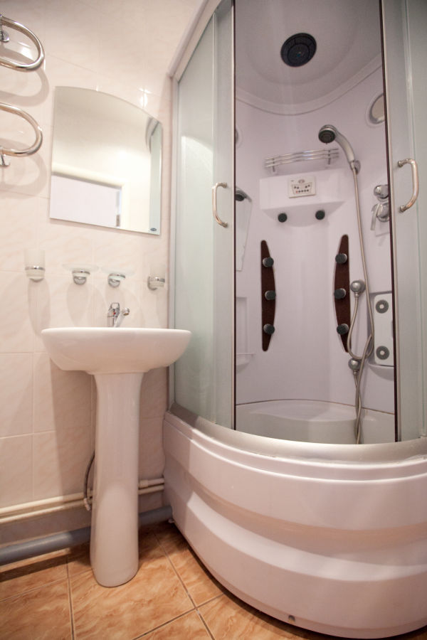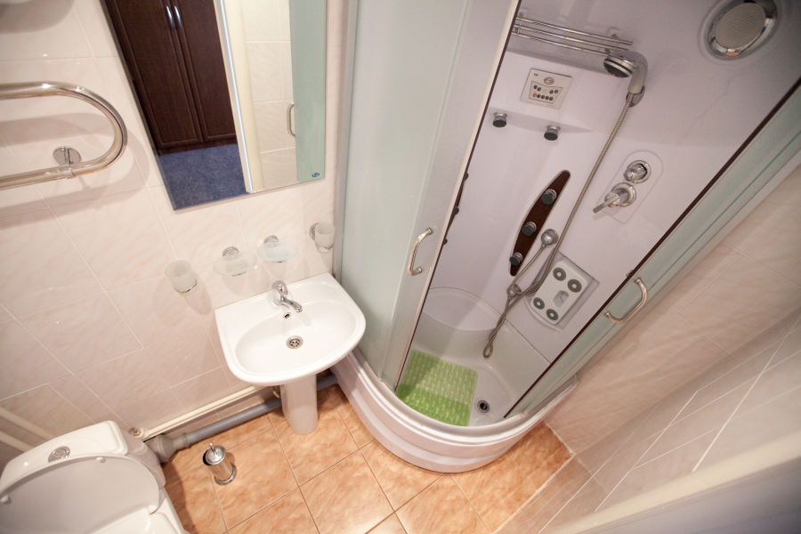 Санузел: с душевой кабиной, туалетные принадлежности, фен.
