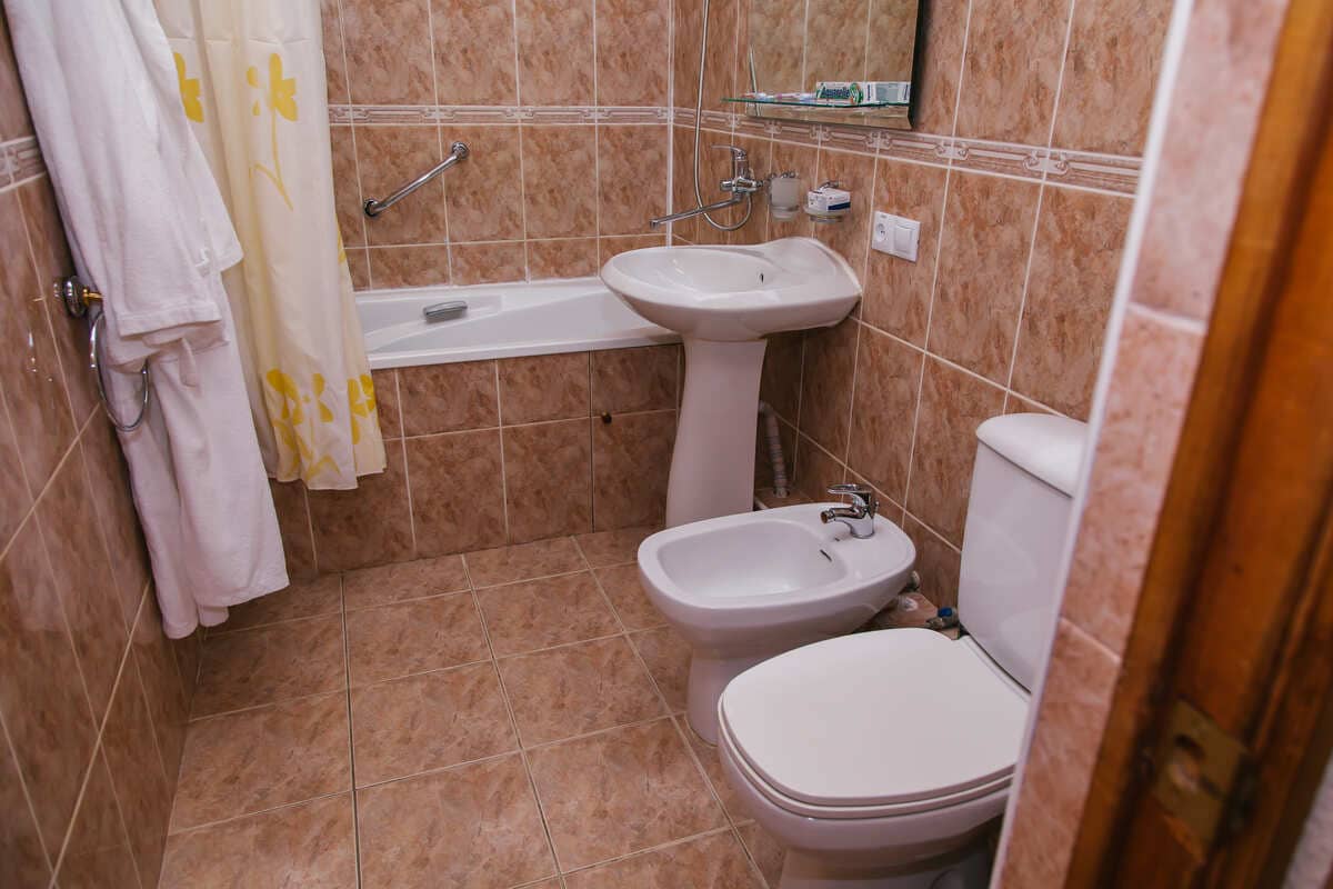 Санузел: биде, с ванной, тапочки, туалетные принадлежности, фен, халат.