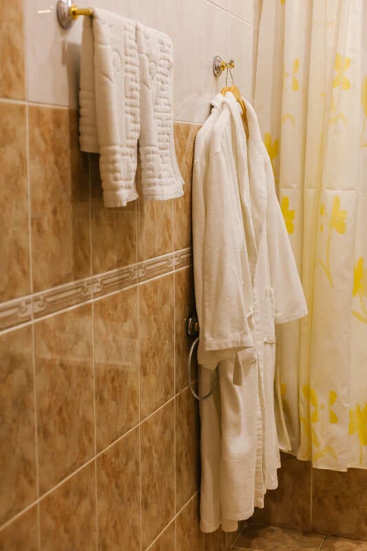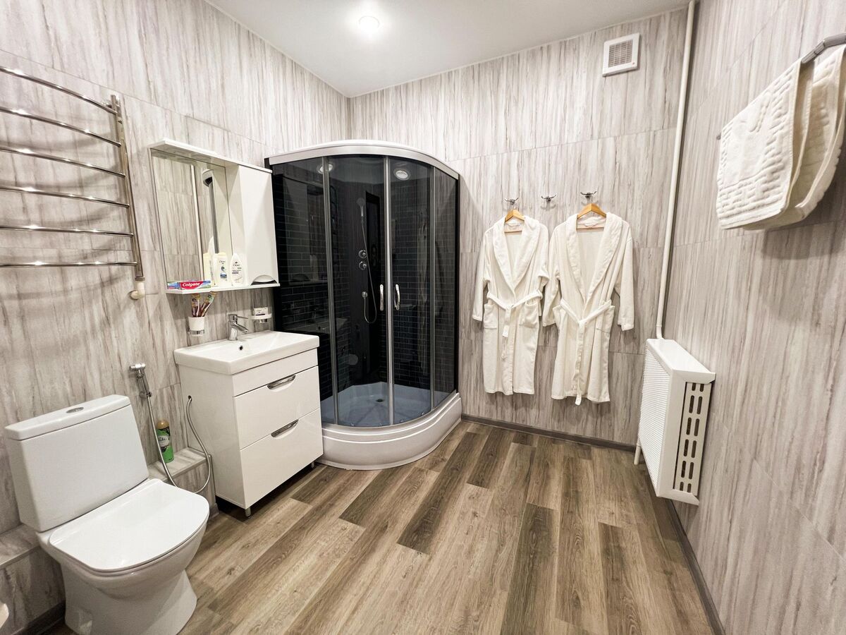Санузел: с душем, тапочки, туалетные принадлежности, фен, халат.