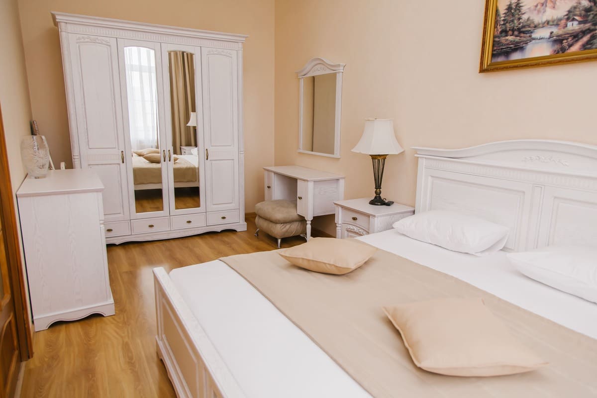 Мебель: вешалка, диван, зеркало, кресла, кровать двуспальная, прикроватные тумбочки, стол, стулья, тумба, шкаф.