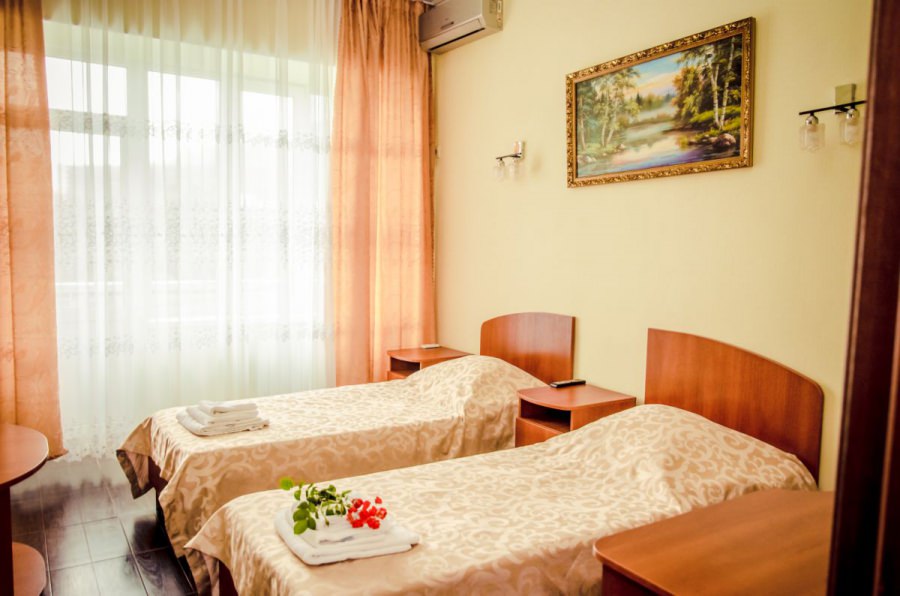 Мебель: Две односпальные кровати, прикроватные тумбочки, стол.