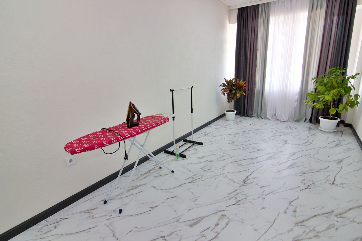 Оборудование: гладильная доска, кондиционер, телевизор, утюг: сушилка для белья, холодильник, чайный набор посуды, электрочайник.