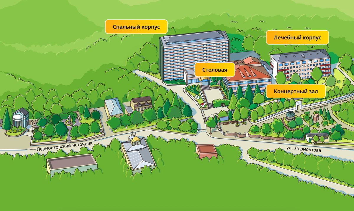 IconОсобенности:Свой бювет с мин. водой, Свой парк, В курортной зоне