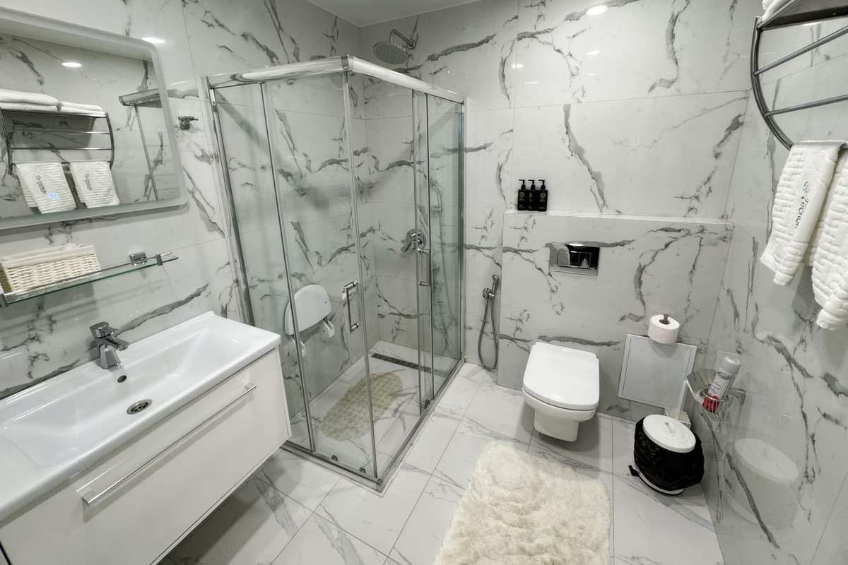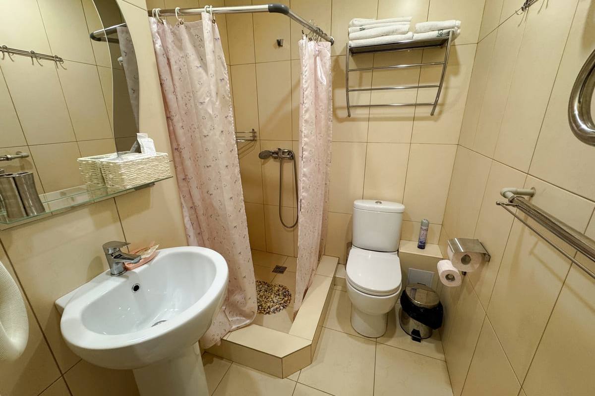 Санузел: с душем, тапочки, туалетные принадлежности, фен, халат.