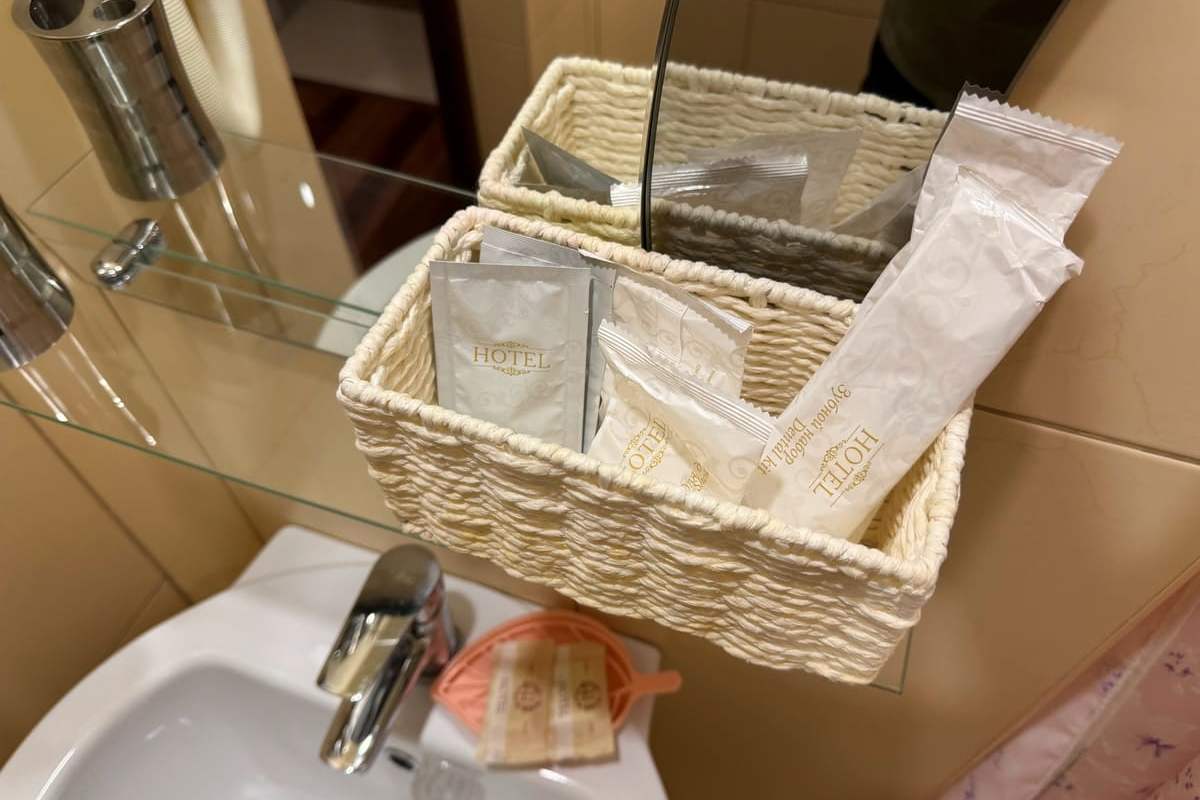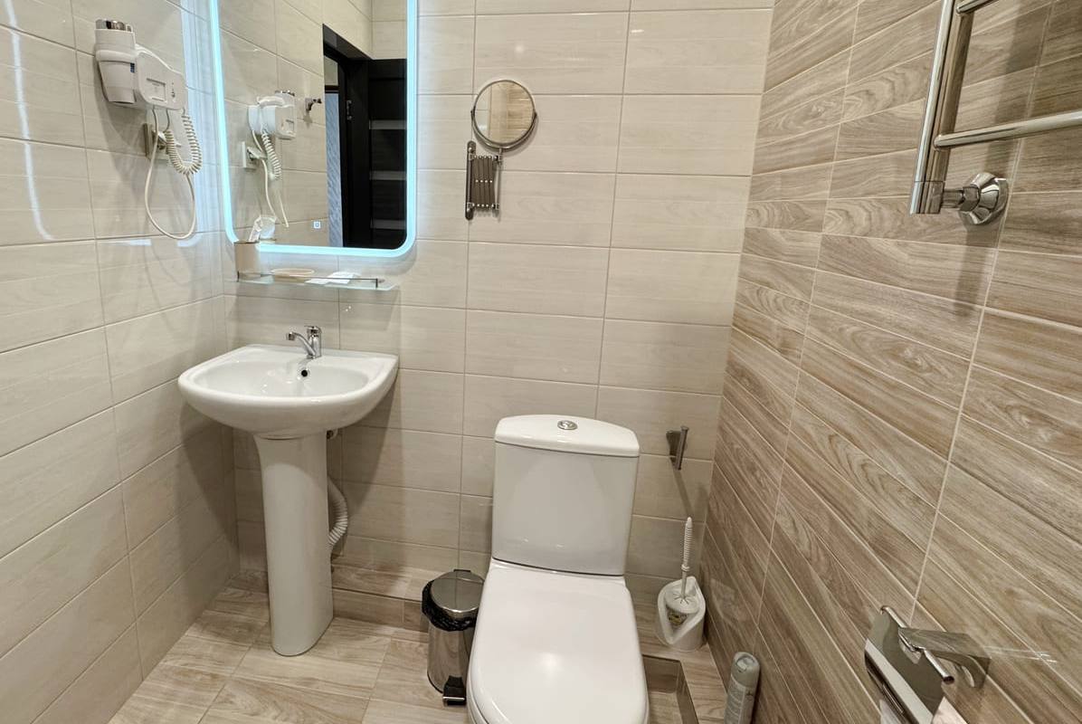 Санузел: тапочки, туалетные принадлежности, фен, халат.