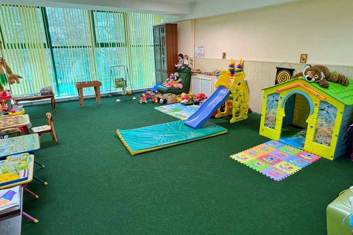 • Дети: детская комната с воспитателем, игровые и творческие зоны, открытая площадка под навесом с качелями